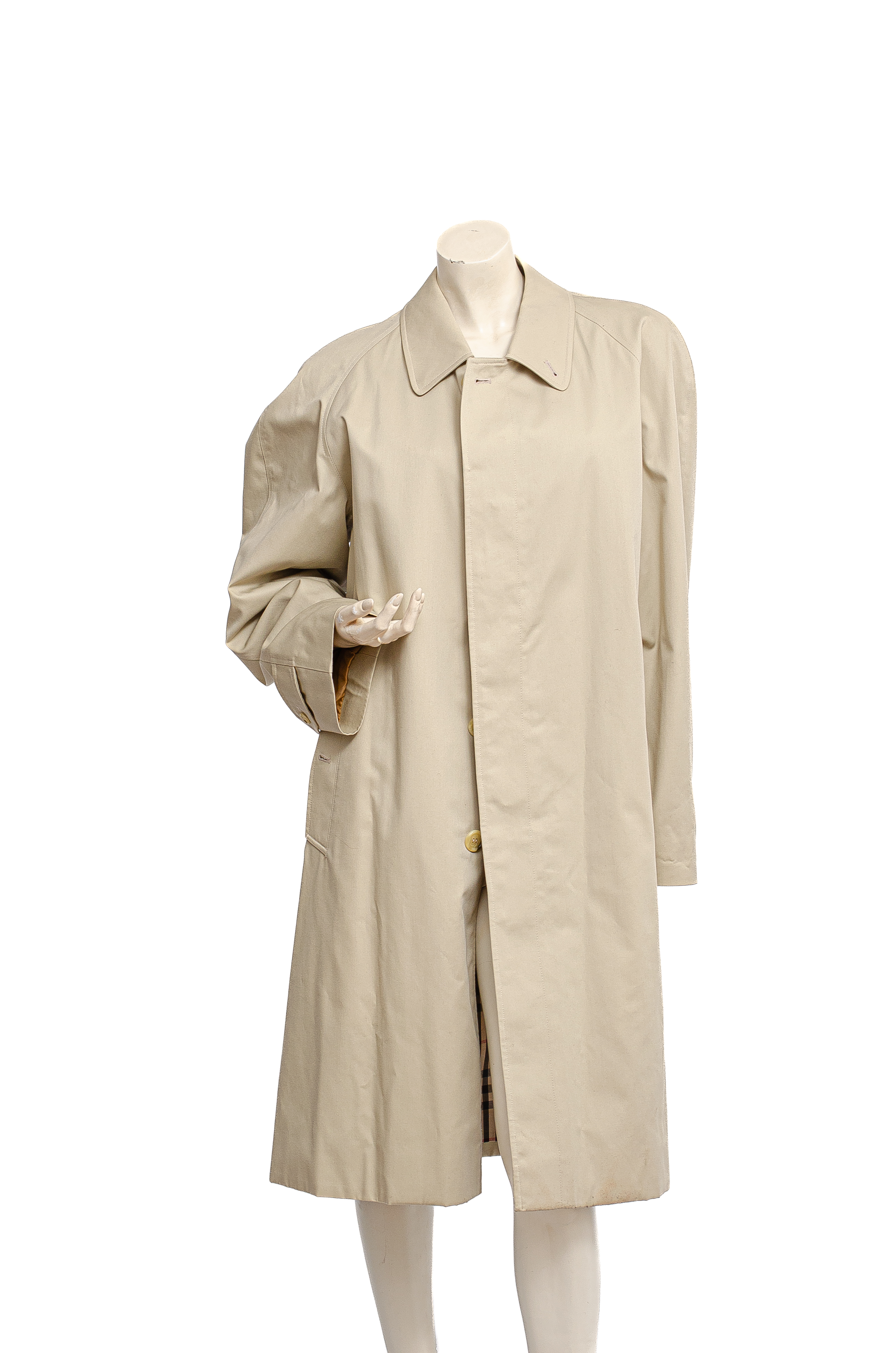 Impermeabile da uomo color miele, fodera interna a tartan, bottoni sul fronte, due tasche verticali. Etichetta di produzione. Taglia 48.