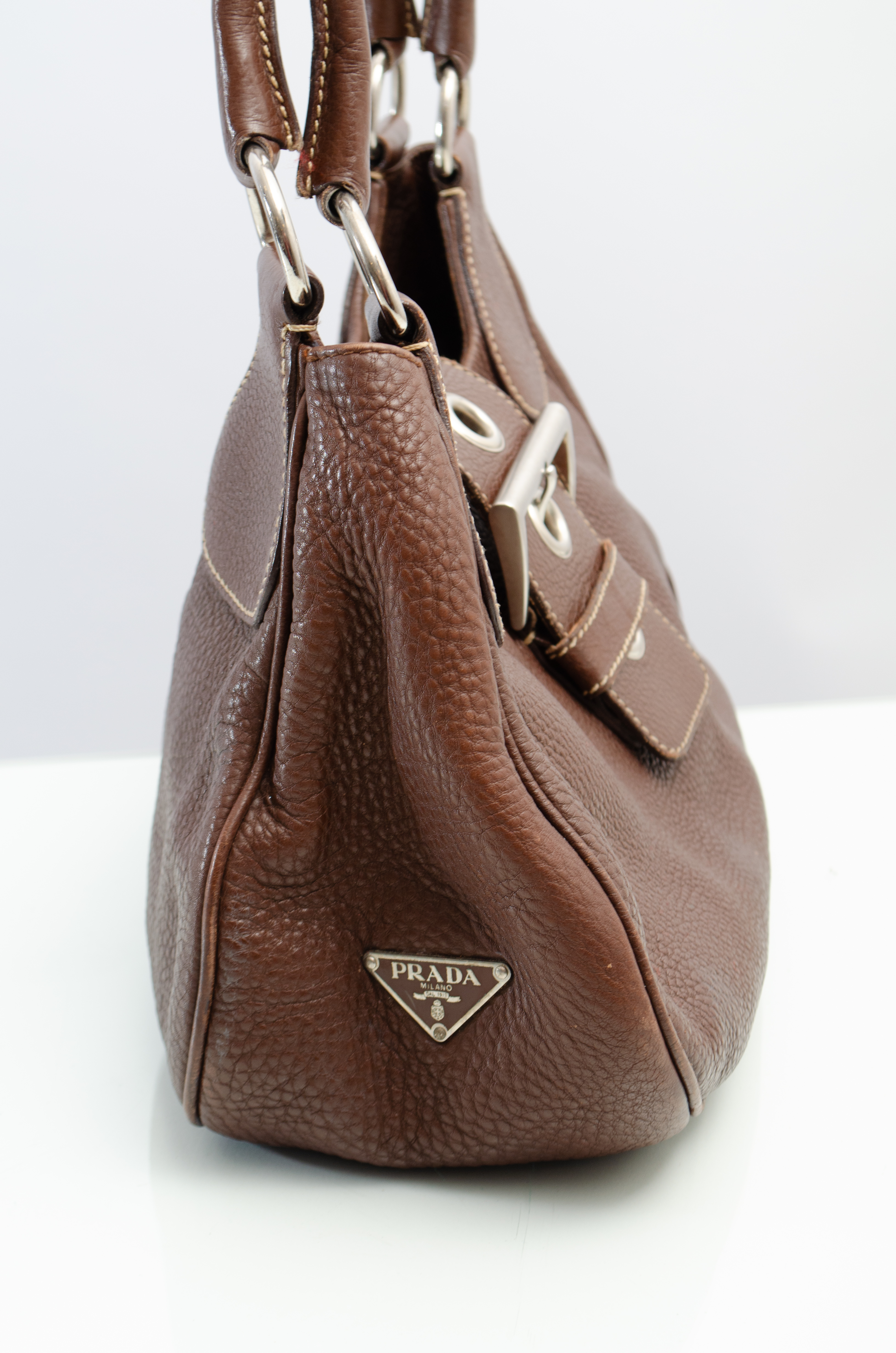 Borsa a spalla in pelle martellata marrone, chiusura con grande fibbia in acciaio spazzolato, minuterie in metallo cromato. All'interno fodera logata marrone, tasca con chiusura a cerniera. Marchio di produzione. Segni di uso.