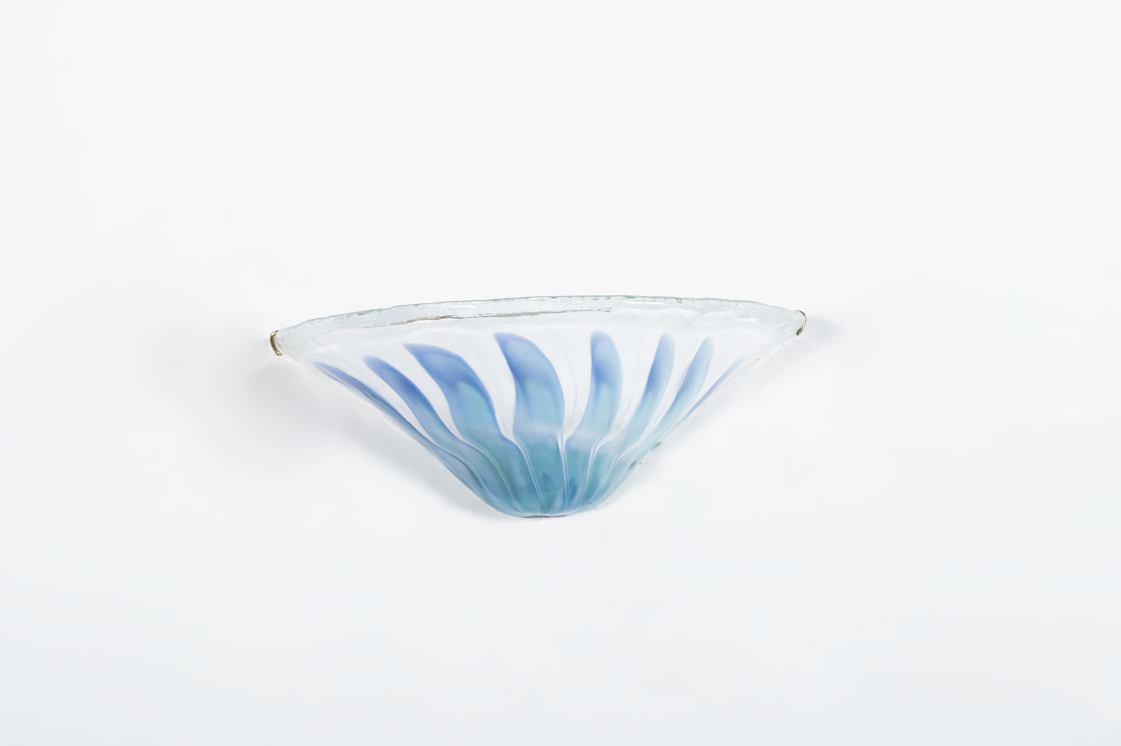 Lampada da parete ad una luce con struttura in metallo dorato e vetro azzurrino, diffusore semiconico in vetro incolore con decori di murrine a petali azzurrini e lattimi. Marchio di produzione.