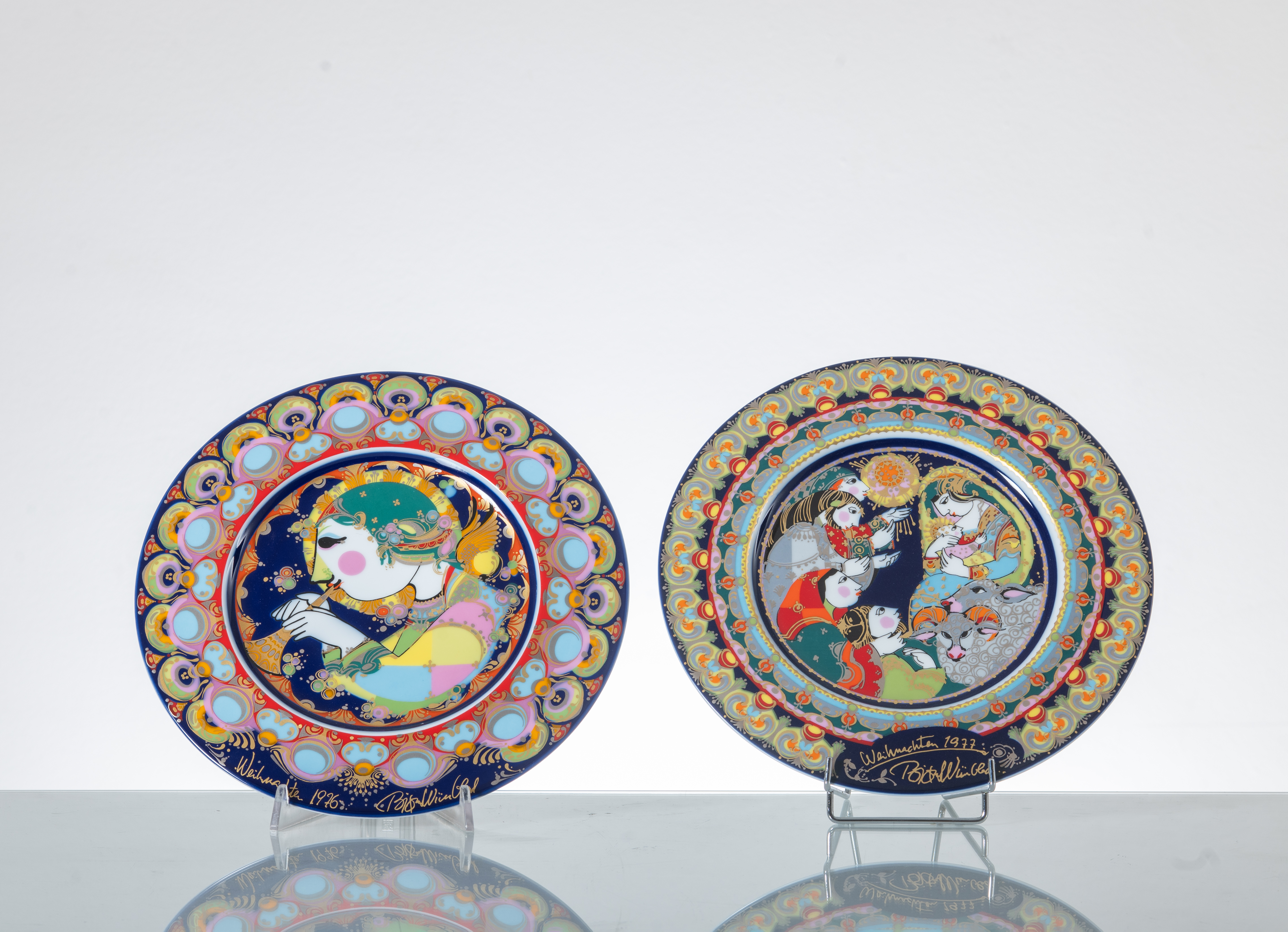 Due piatti circolari commemorativi Natale 1976 e 1977 in ceramica decorata in policromia e oro. Quello del 1976 "Angel with Trumpet", quello del 1977 "Adoration of the Shepherds". Firma e marchio di produzione.