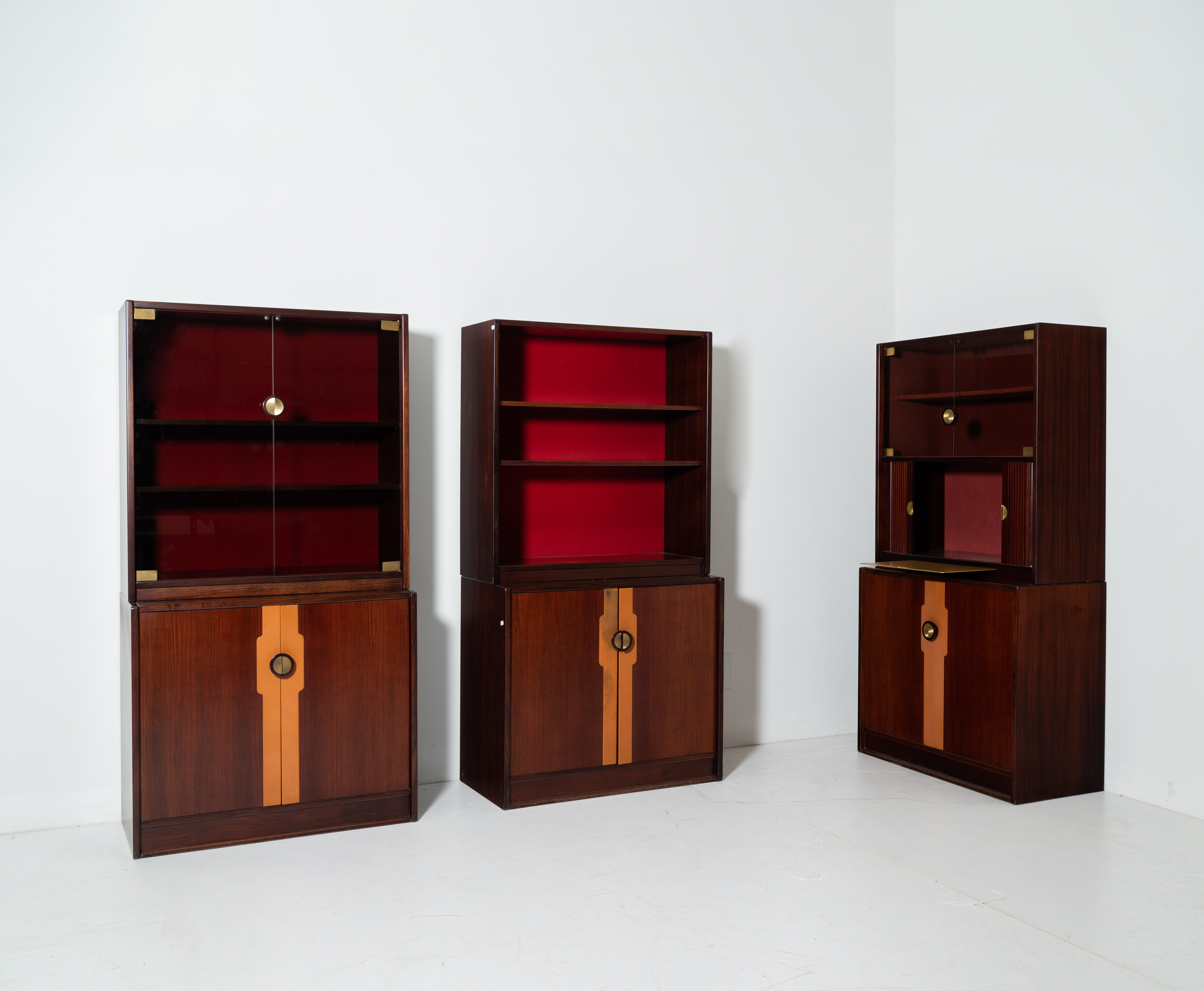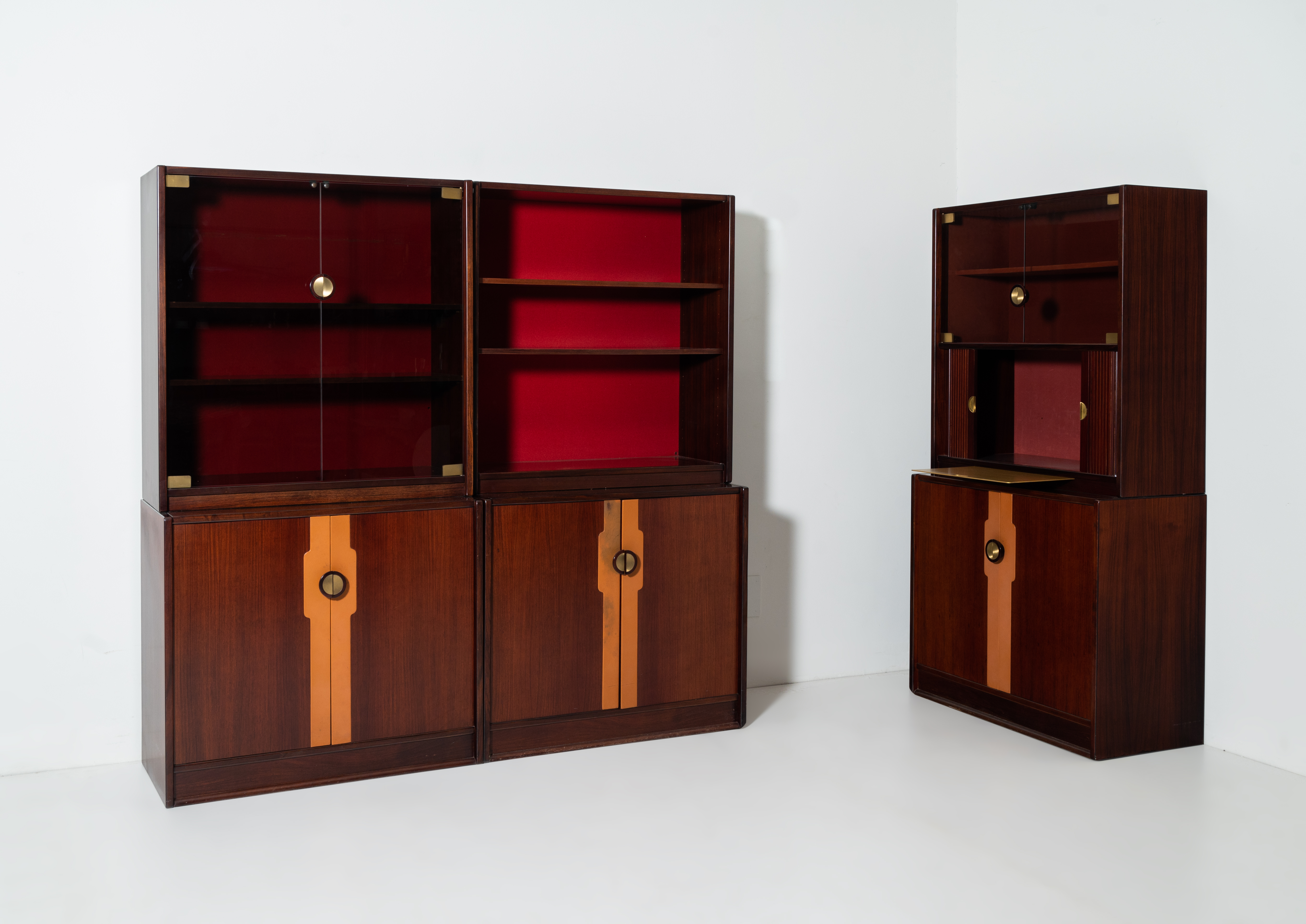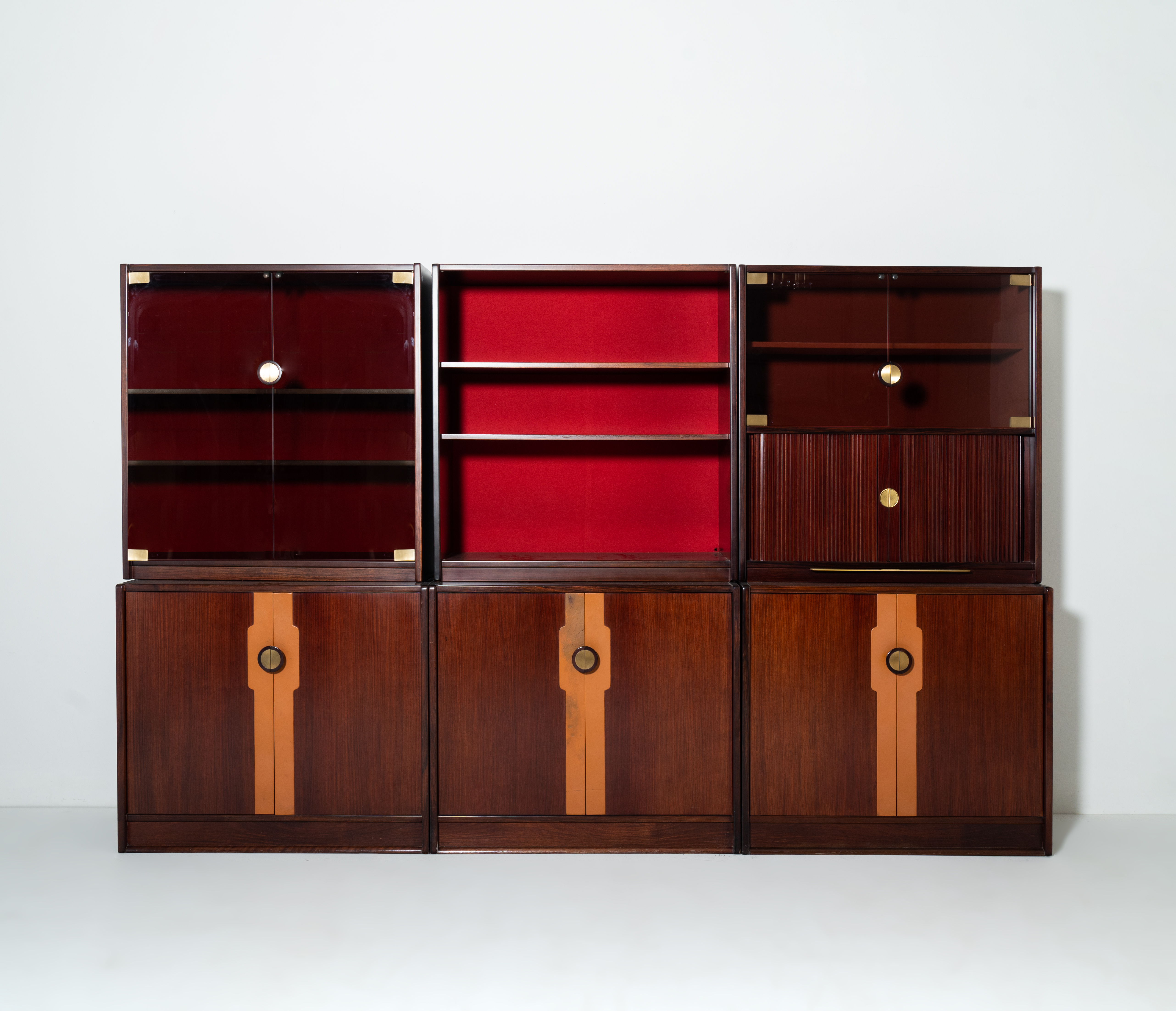 Mobile contenitore alto in legno esotico composto da tre elementi, sul fronte nella parte posteriore ciascuno ha un vano chiuso con due ante battenti decorate con motivo geometrico in pelle marrone, sulla parte superiore un vano chiuso con ante battenti in vetro fumè, un vano con mensole a giorno ed un vano chiuso con ante battenti in vetro fumè con sottostante vano bar chiuso con ante a serranda scorrevole in legno e con ridetto a scomparsa, minuterie in metallo dorato. Segni di uso e difetto alla pelle.
