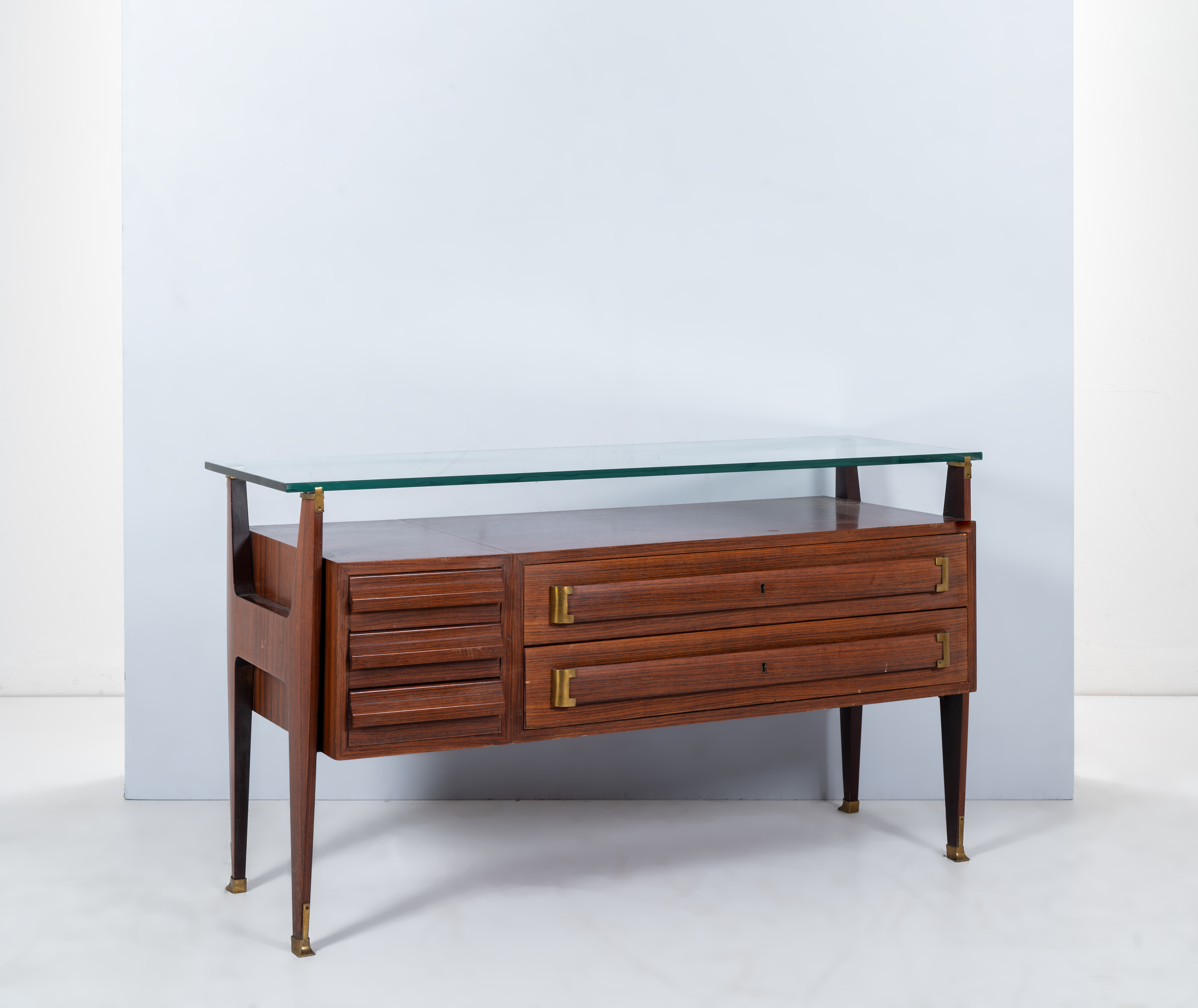 Mobile contenitore con cassetti in legno esotico, sul fronte tre cassetti laterali e due più lunghi con chiusura e dettagli in ottone, piano rettangolare sospeso in cristallo di grosso spessore, fianchi ad H con dettagli in ottone. Segni di uso.