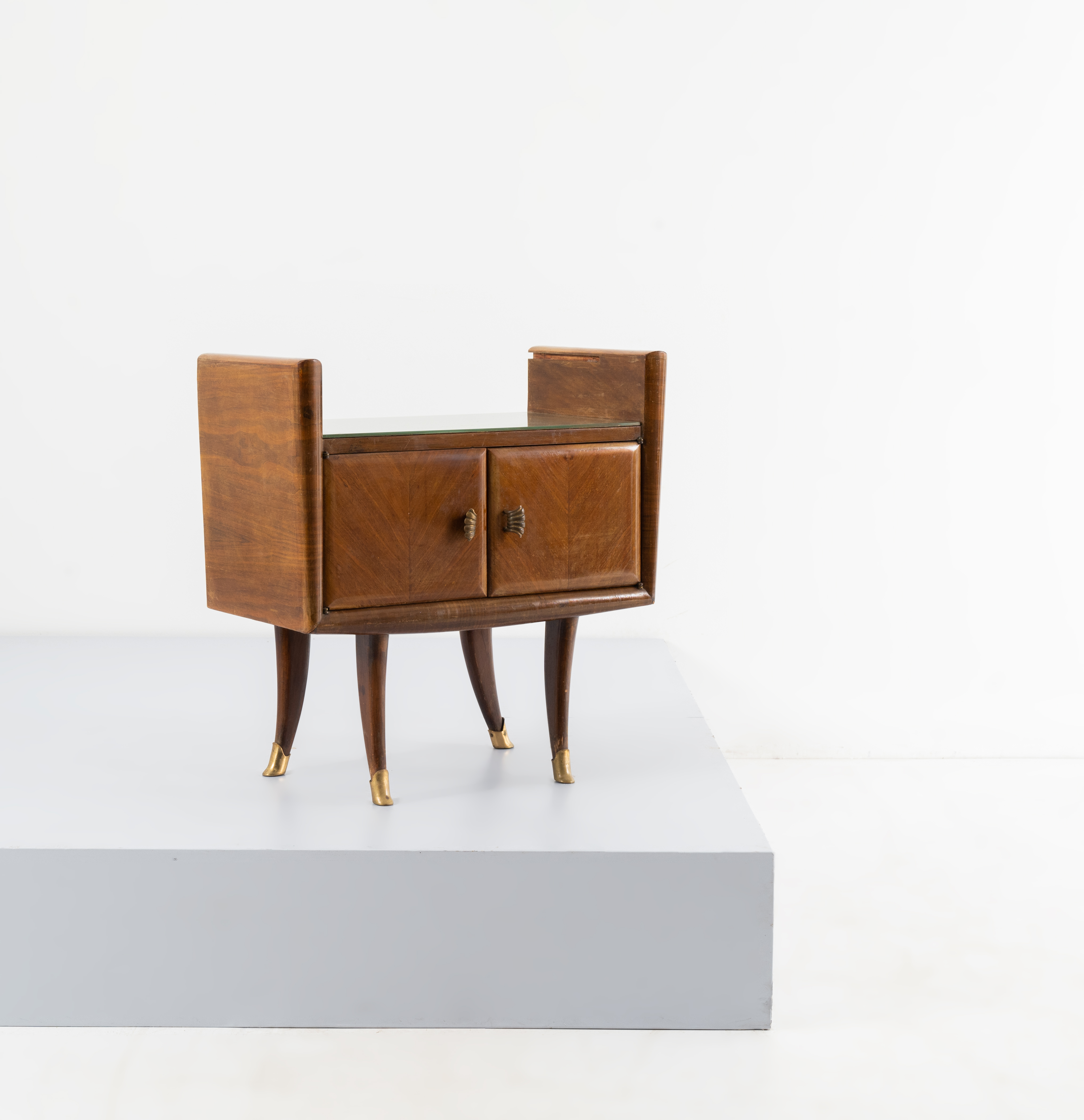 Comodino con struttura in legno di noce, piano rettangolare in vetro, sul fronte un vano chiuso con due ante a battente, maniglie e minuterie in ottone, gambe sagomate. Segni di uso e vetro sopra piano mancante.