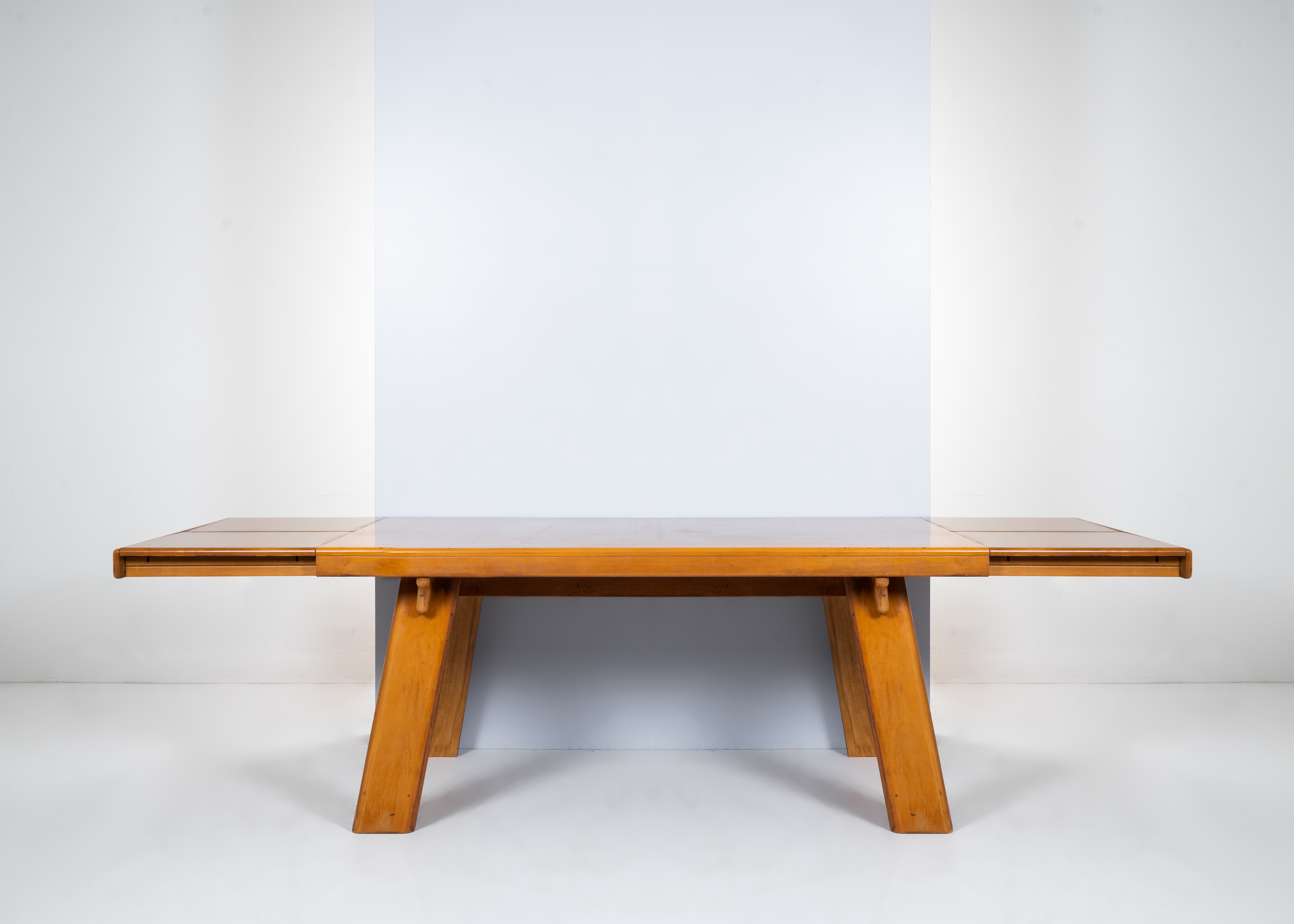 Tavolo in legno massello di noce, piano rettangolare, segni di uso e difetti.
