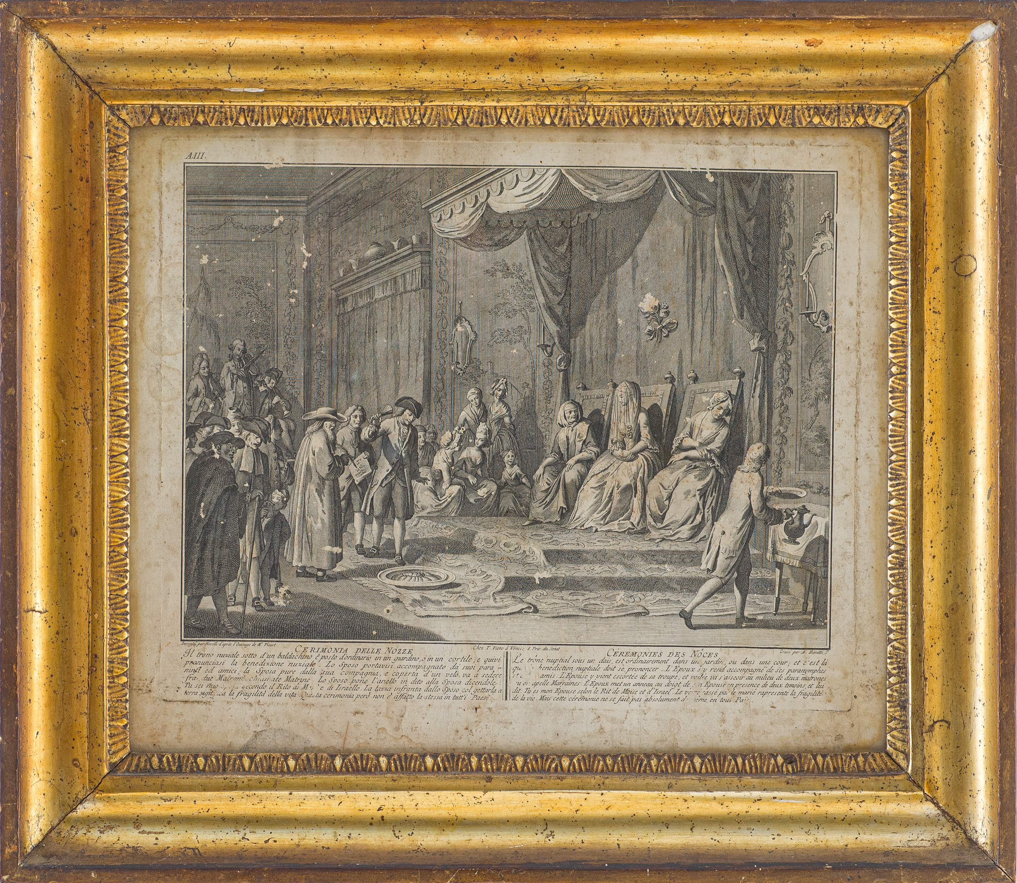 Coppia di incisioni su carta a bulino raffiguranti "La festa di Pasqua" e "La cerimonia delle nozze" entro cornici a canna ciaccata in legno dorato ad argento e mistura