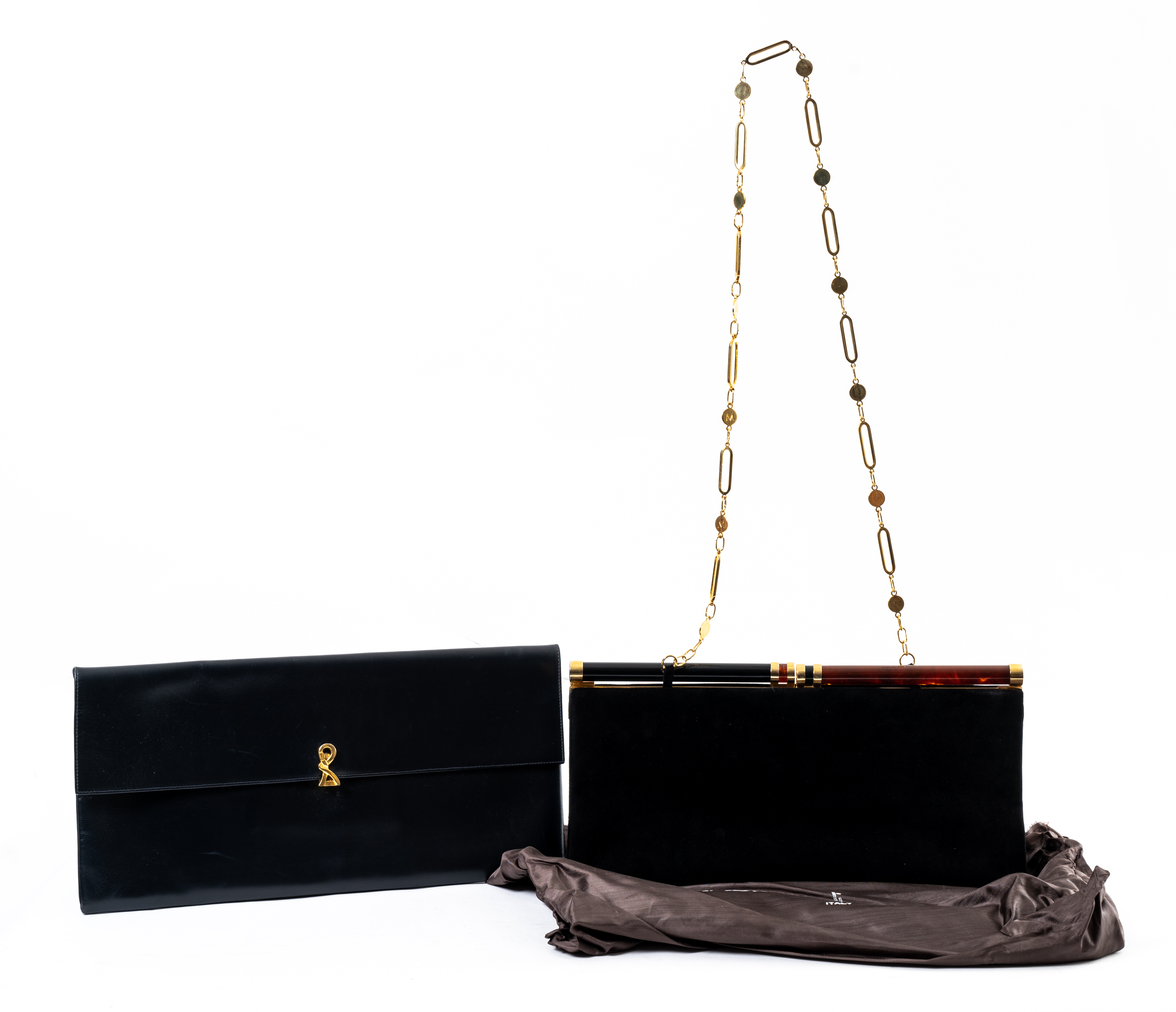 Borsa a busta in pelle di vitello blu, tasca interna, apertura sul fronte, chiusura con monogramma “R” in metallo dorato, marchio di produzione. Borsa a busta in pelle di camoscio nera, chiusura superiore in tubolari di resina marrone, metallo dorato, tracolla a catena dorata intervallata da maglie ad M. Marchio di produzione.