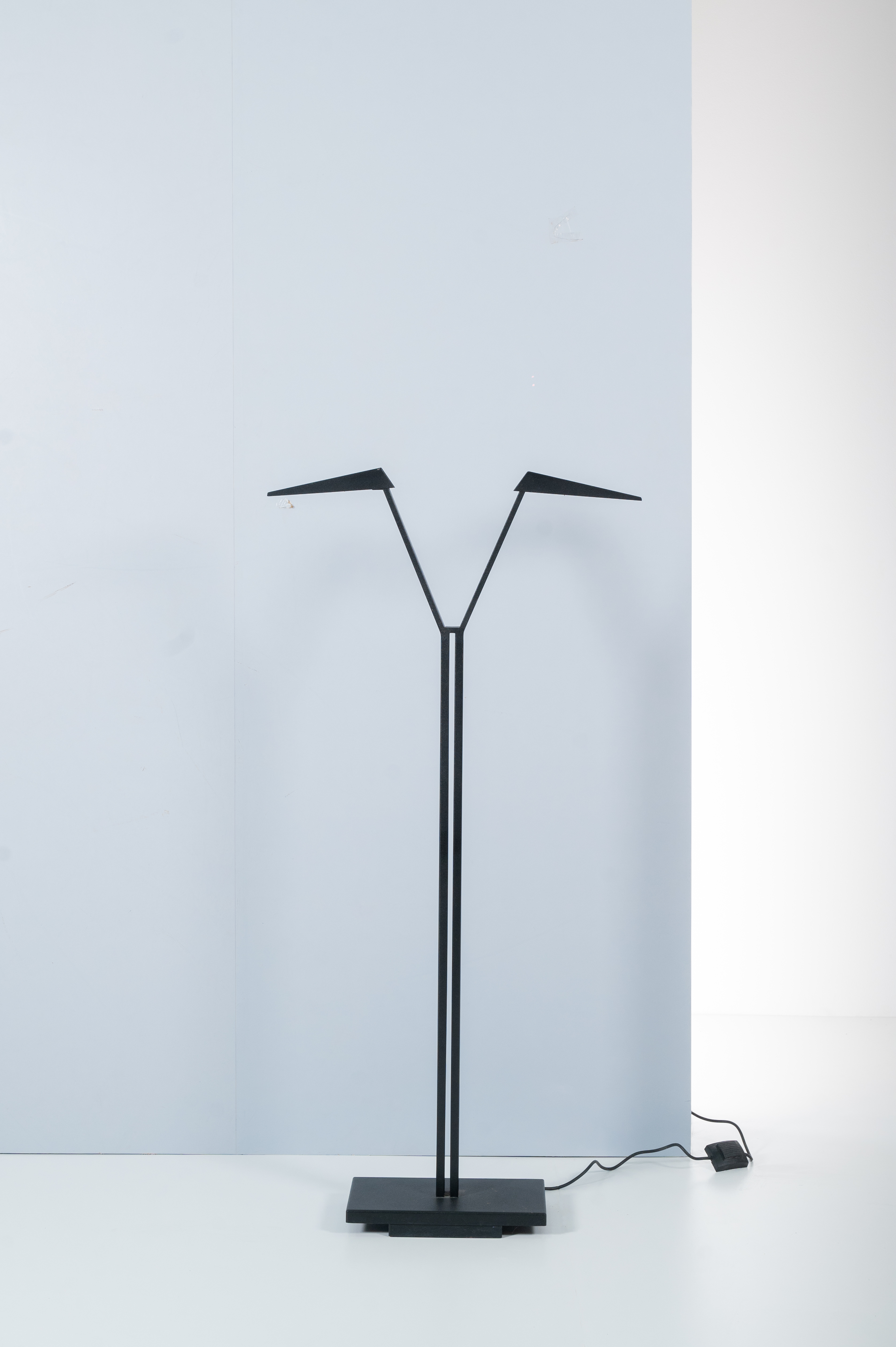 Lampada da terra a due luci modello 'Zeus', struttura in metallo verniciato nero satinato, diffusori geometrici orientabili, base di forma rettangolare.