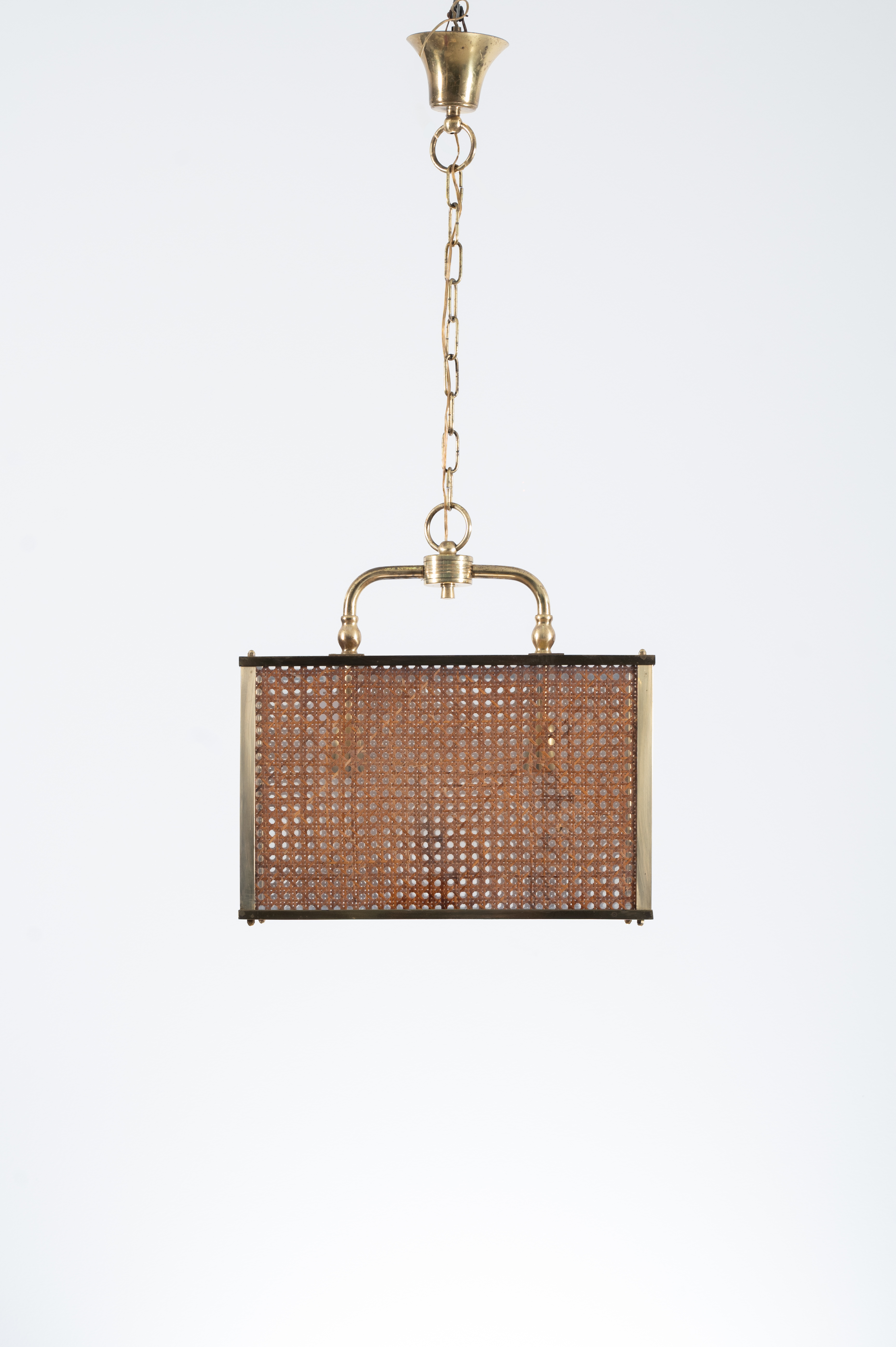 Lampada a sospensione a due luci con struttura in metallo dorato, diffusore a parallelepipedo in plexiglass trasparente e midollino intrecciato. Lievi ossidazioni.