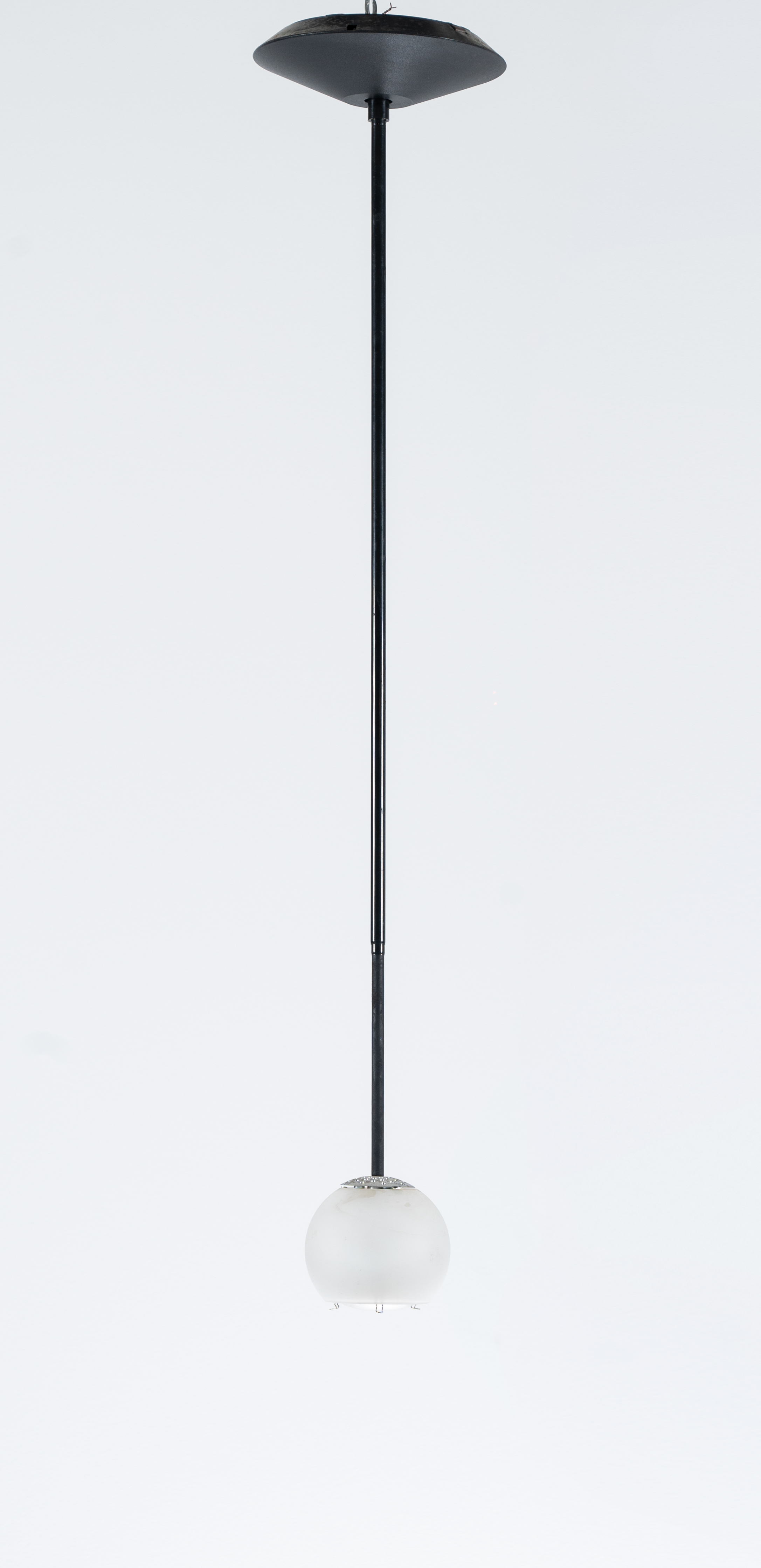 Una lampada modello "Phonix" ad una luce con struttura allungabile in metallo verniciato nero, diffusore sferico in acciaio e vetro satinato opale.