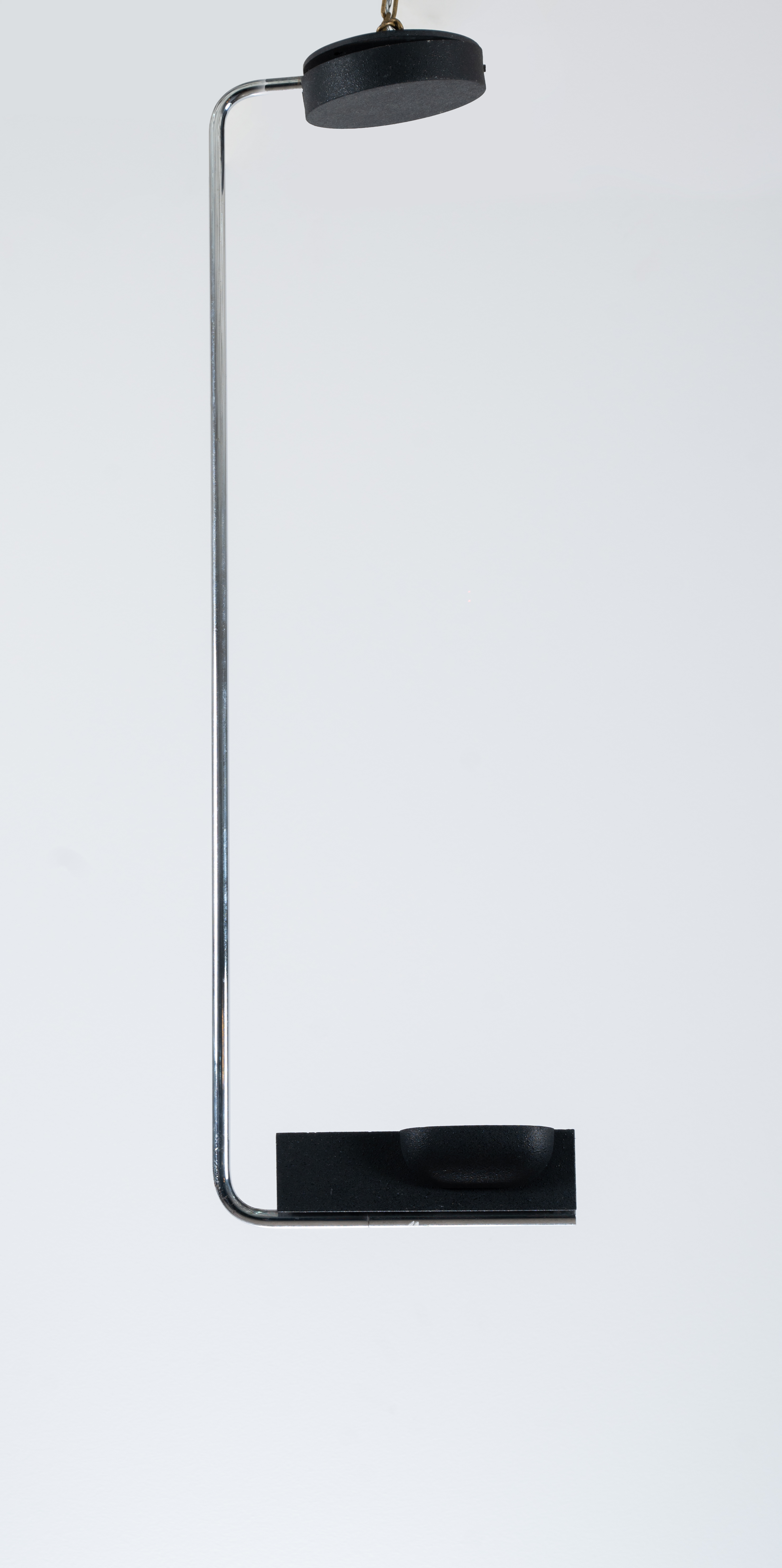 Lampada a sospensione ad una luce con struttura in metallo tubolare cromato, diffusore orientabile in metallo verniciato nero.