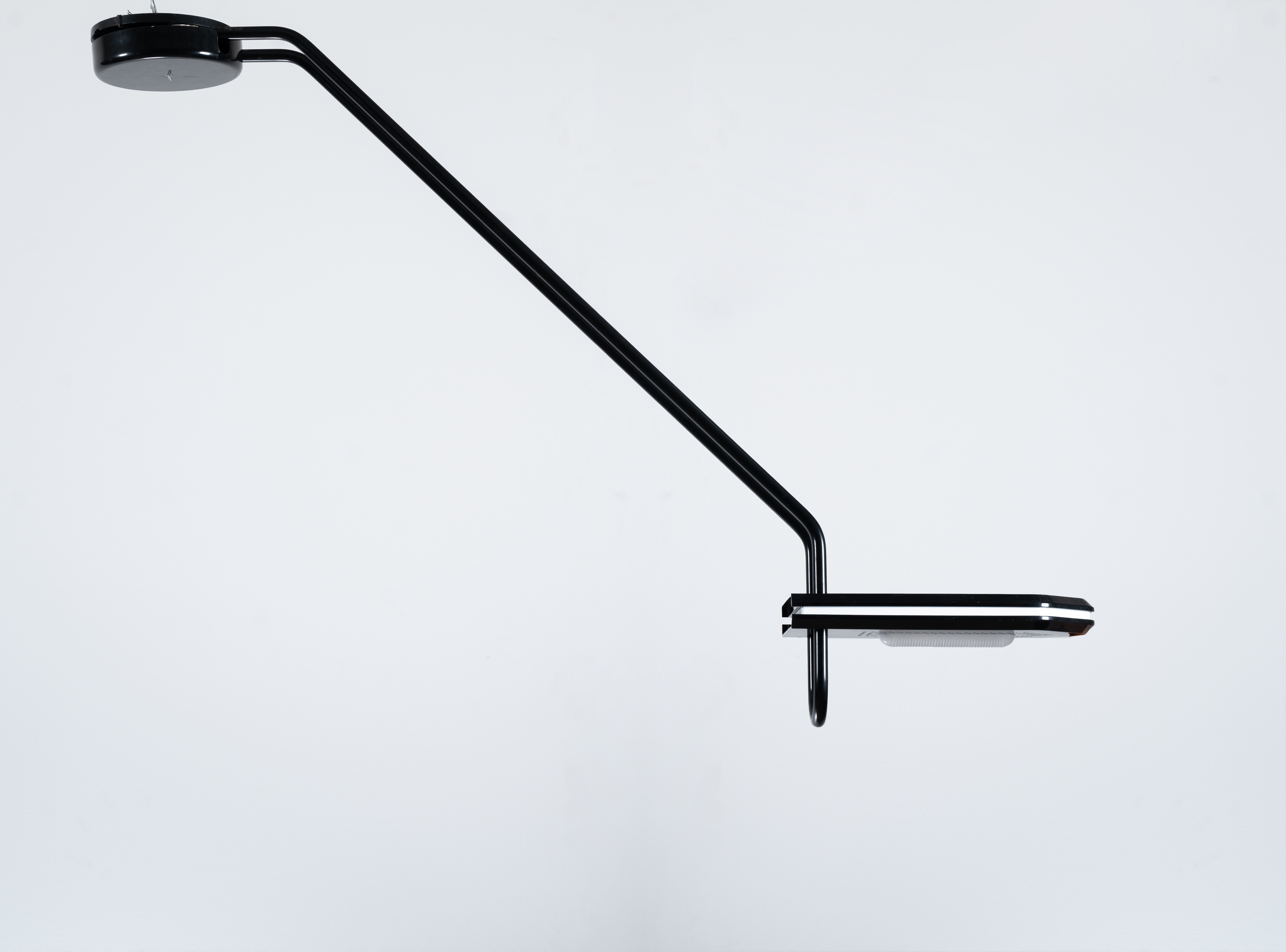 Lampada a sospensione ad una luce con struttura in tubolare metallico verniciato nero, diffusore geometrico piatto in metallo verniciato nero e bianco.