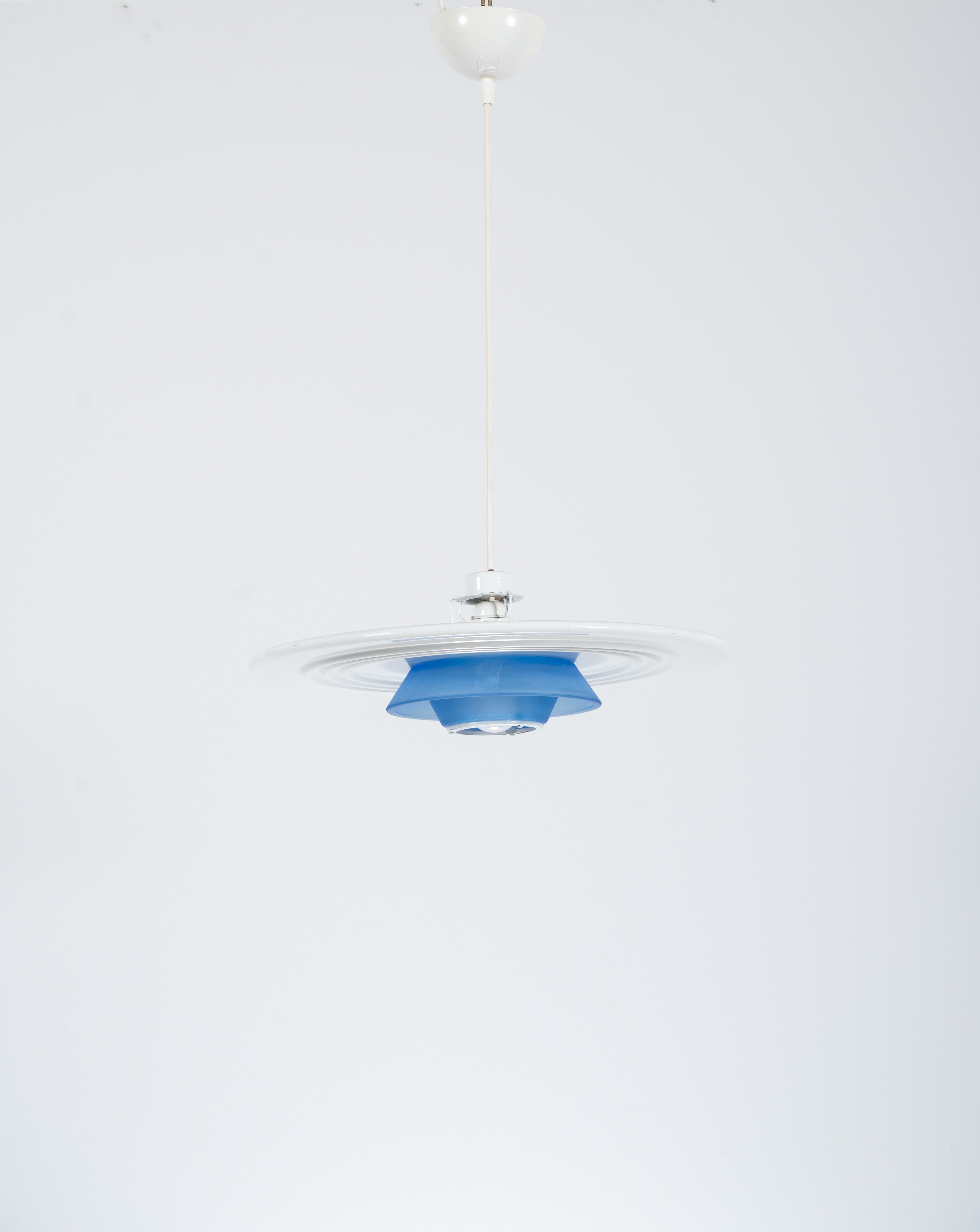 Lampada a sospensione ad una luce, diffusore a disco in metallo verniciato bianco e vetro satinato blu.