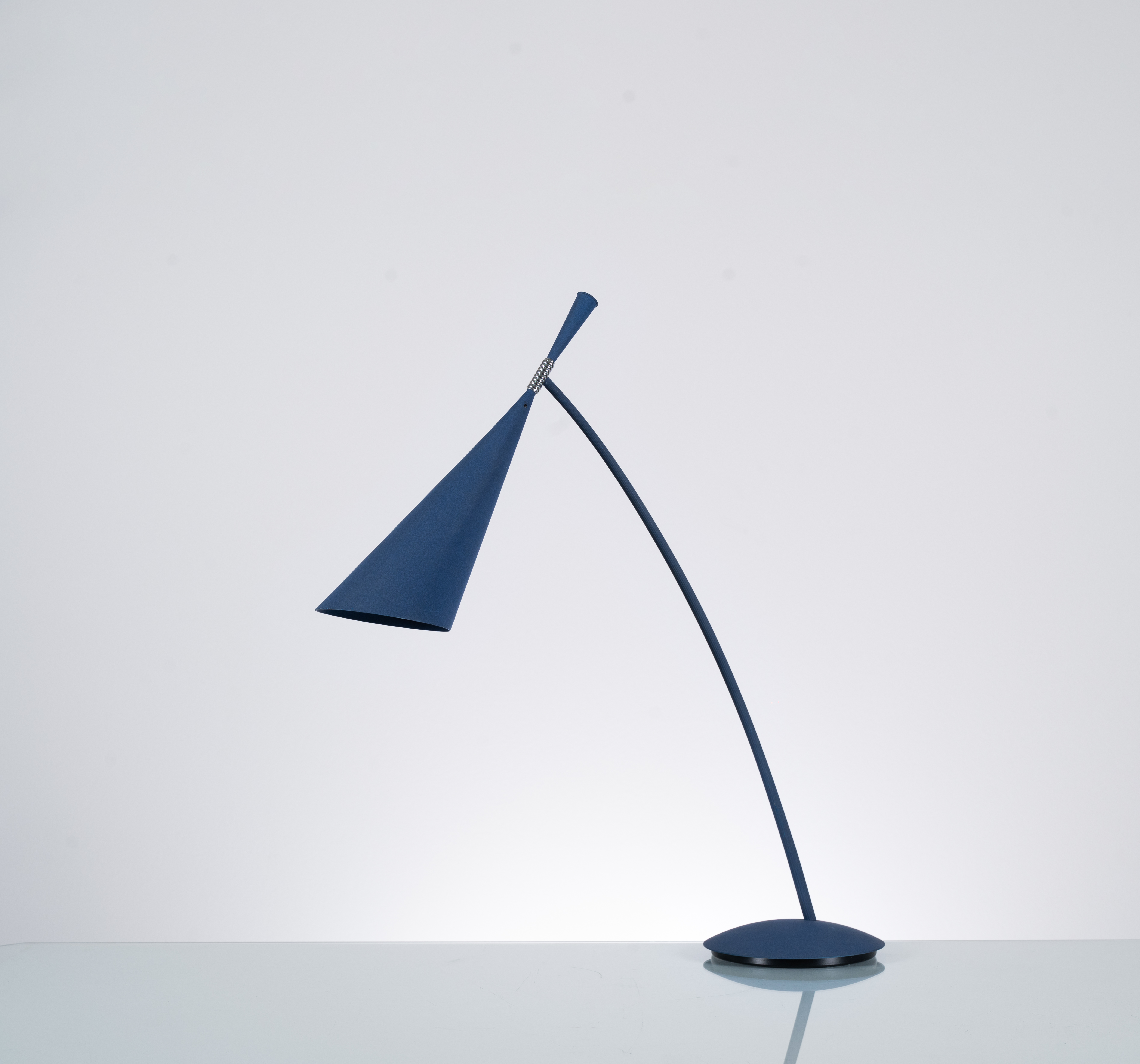 Lampada da tavolo ad una luce modello 'Violetta', struttura in metallo verniciato blu opaco, diffusore conico. Giungi in metallo cromato.