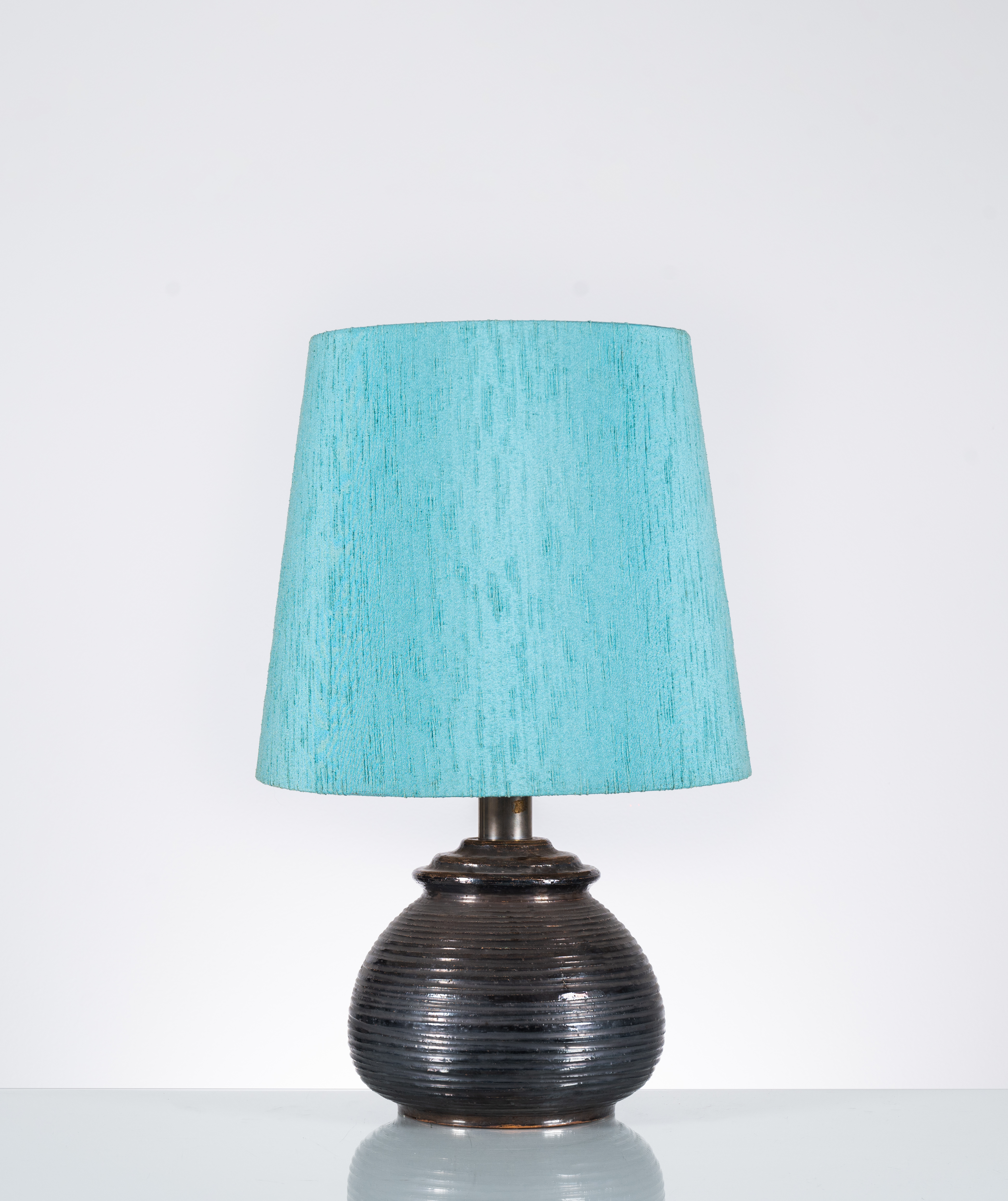 Lampada da tavolo ad una luce, corpo in ceramica smaltato ed invetriato color argento decorato con rigature informi, diffusore in tessuto color turchese.