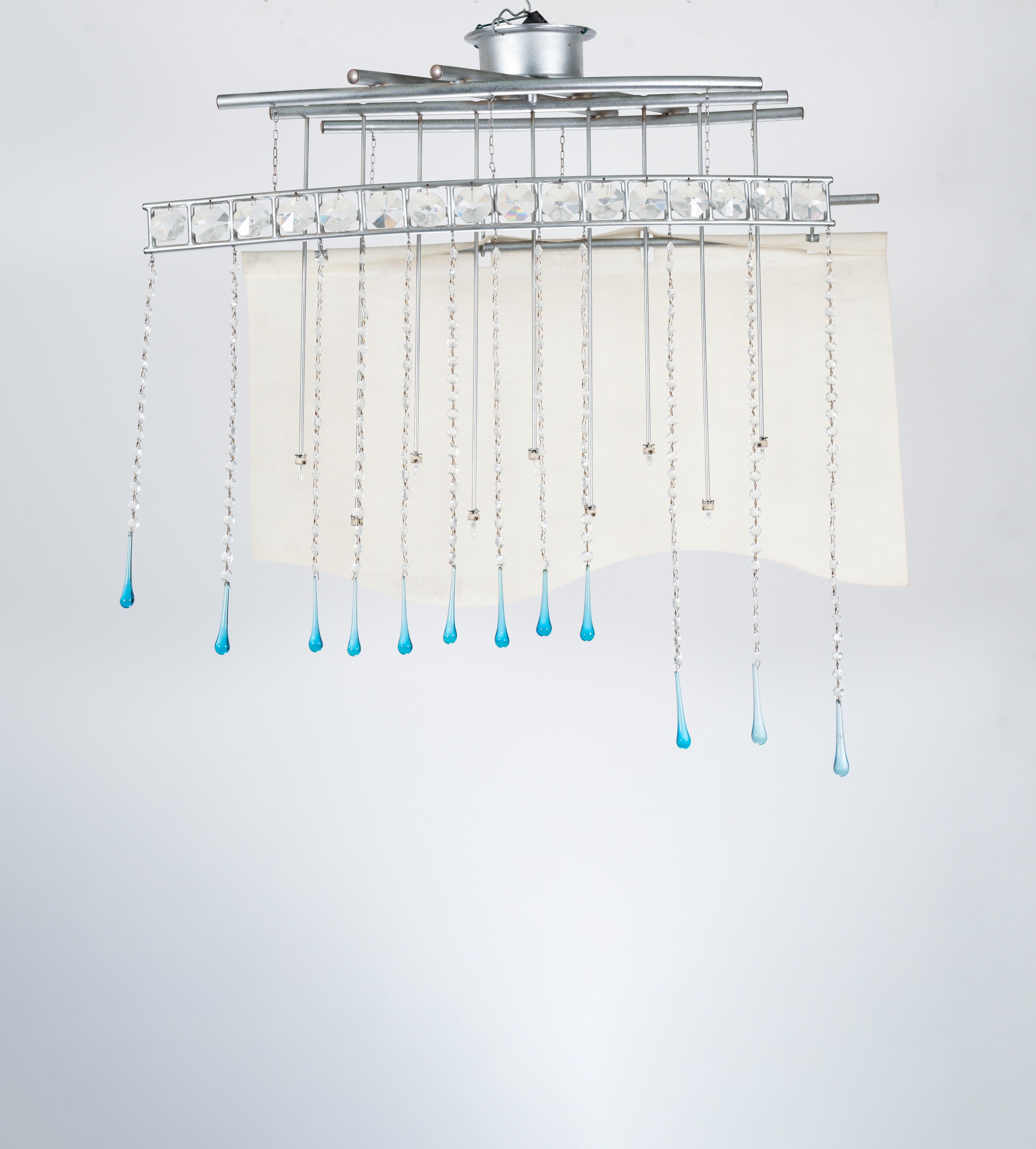Lampada a sospensione a 9 luci modello 'Osiride 110' con struttura in metallo cromato, corpo a gondola decorato da un lato con cristalli trasparenti e gocce pendenti in cristallo azzurro, dall'altro con vela in tessuto color avorio. Marchio di produzione.