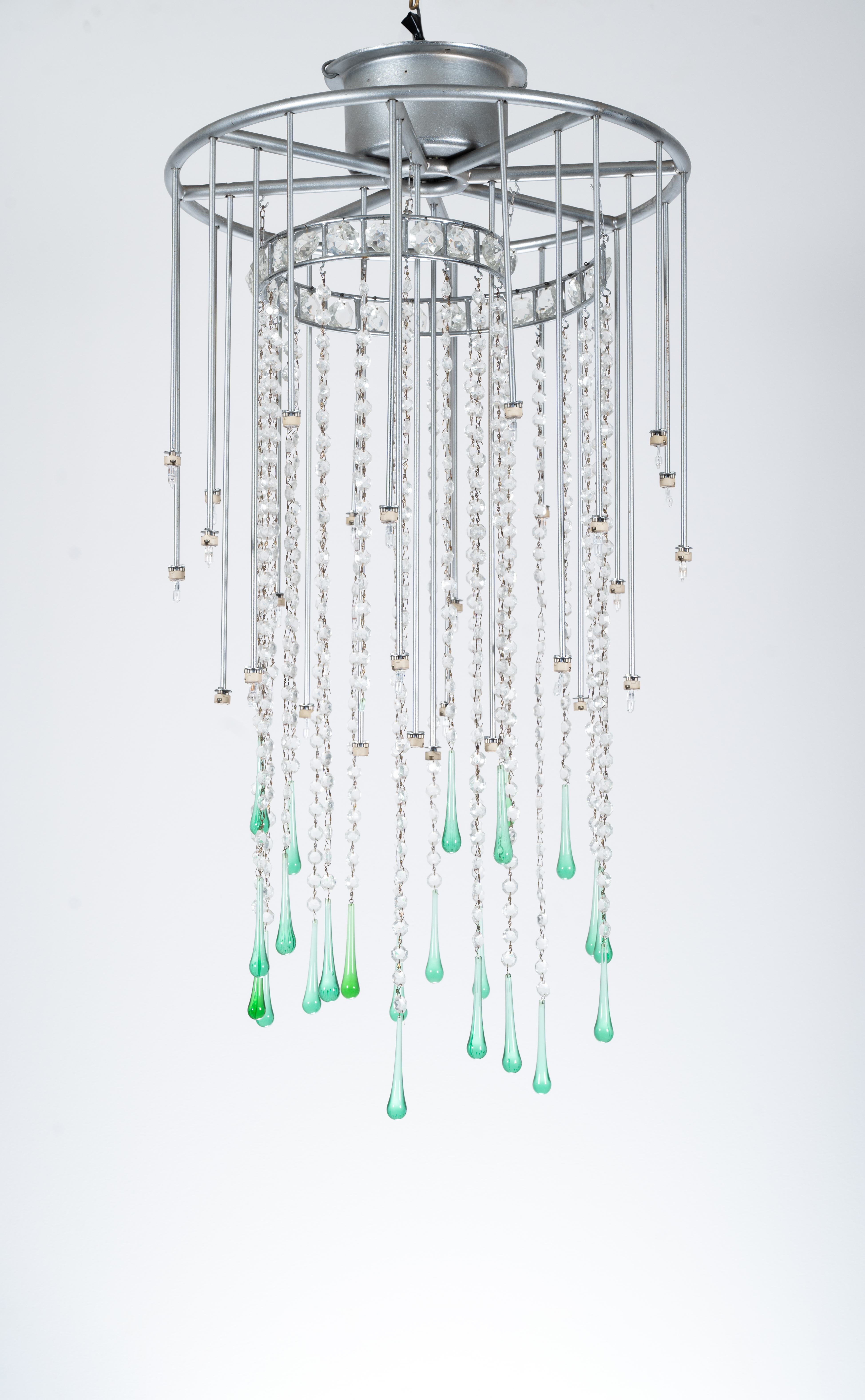 Lampada a sospensione a 24 luci modello 'Auride', in acciaio verniciato grigio decorato con cristalli molati ed a goccia verde trasparente.