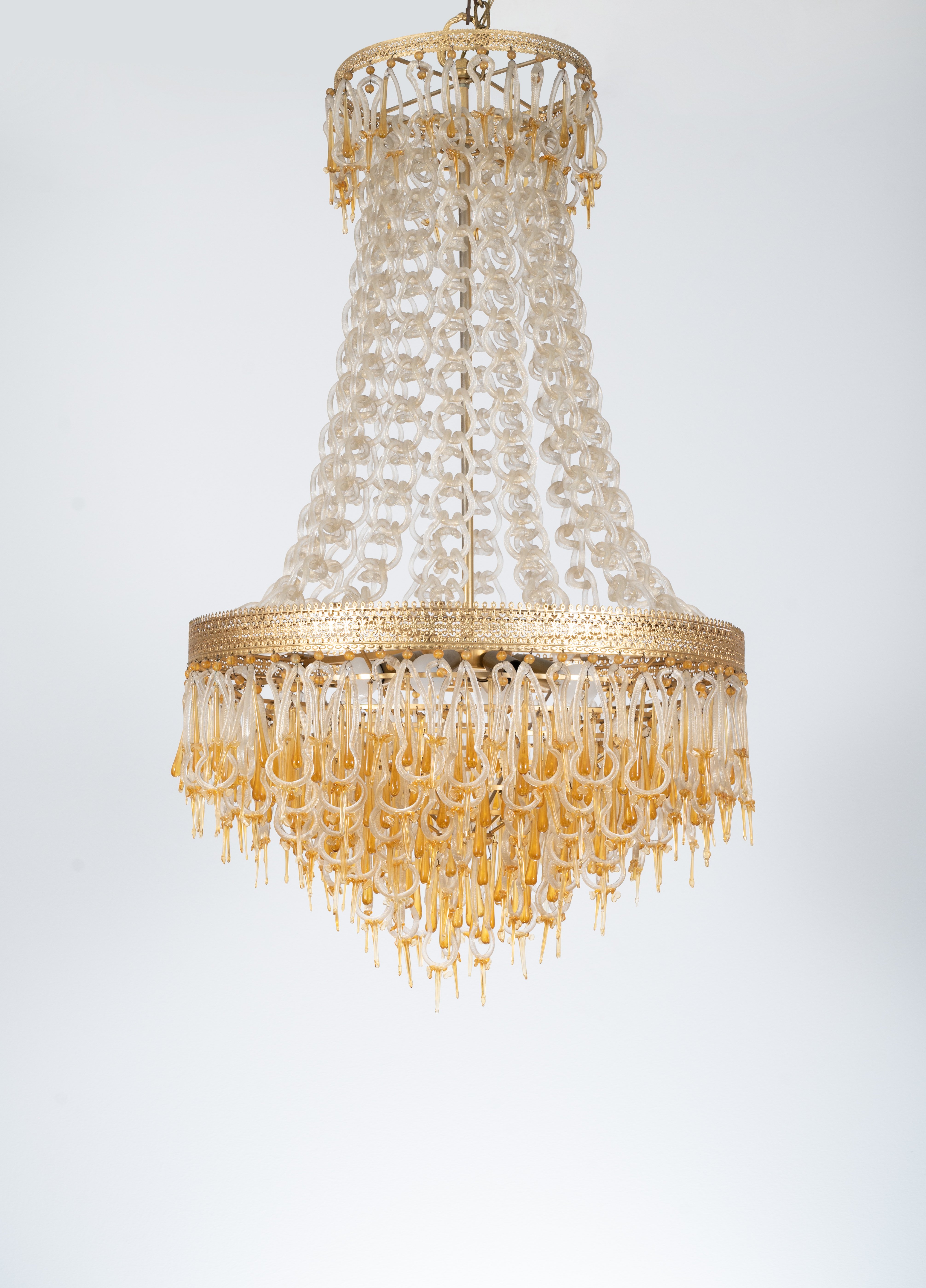 Lampada a sospensione con struttura in metallo bagno oro, decorato con catene e pendenti in vetro soffiato incolore ed ambra. Difetti.