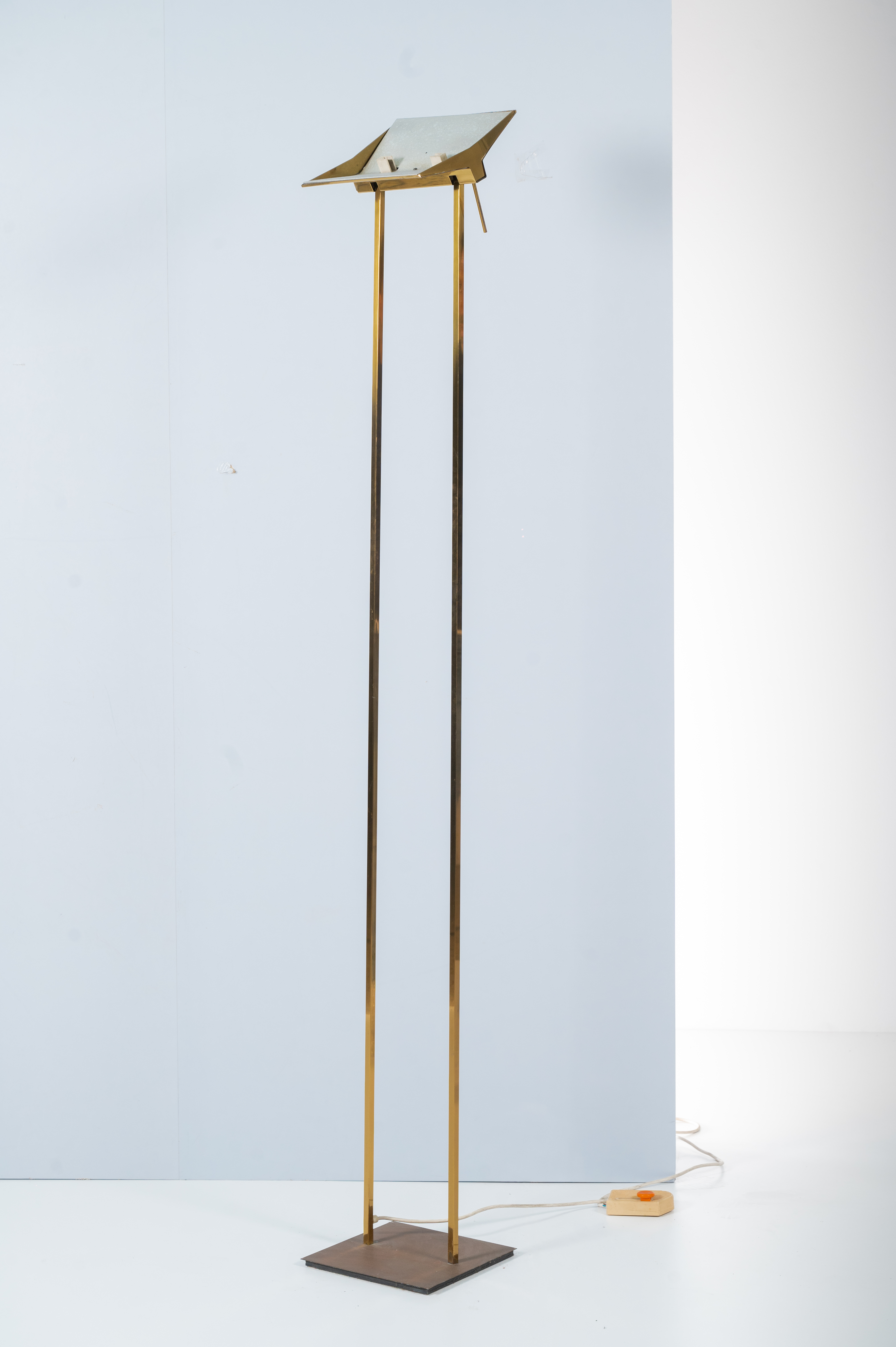 Lampada da terra ad una luce con struttura in ottone e diffusore orientabile a libro, base quadrata. Ossidazioni alla base.