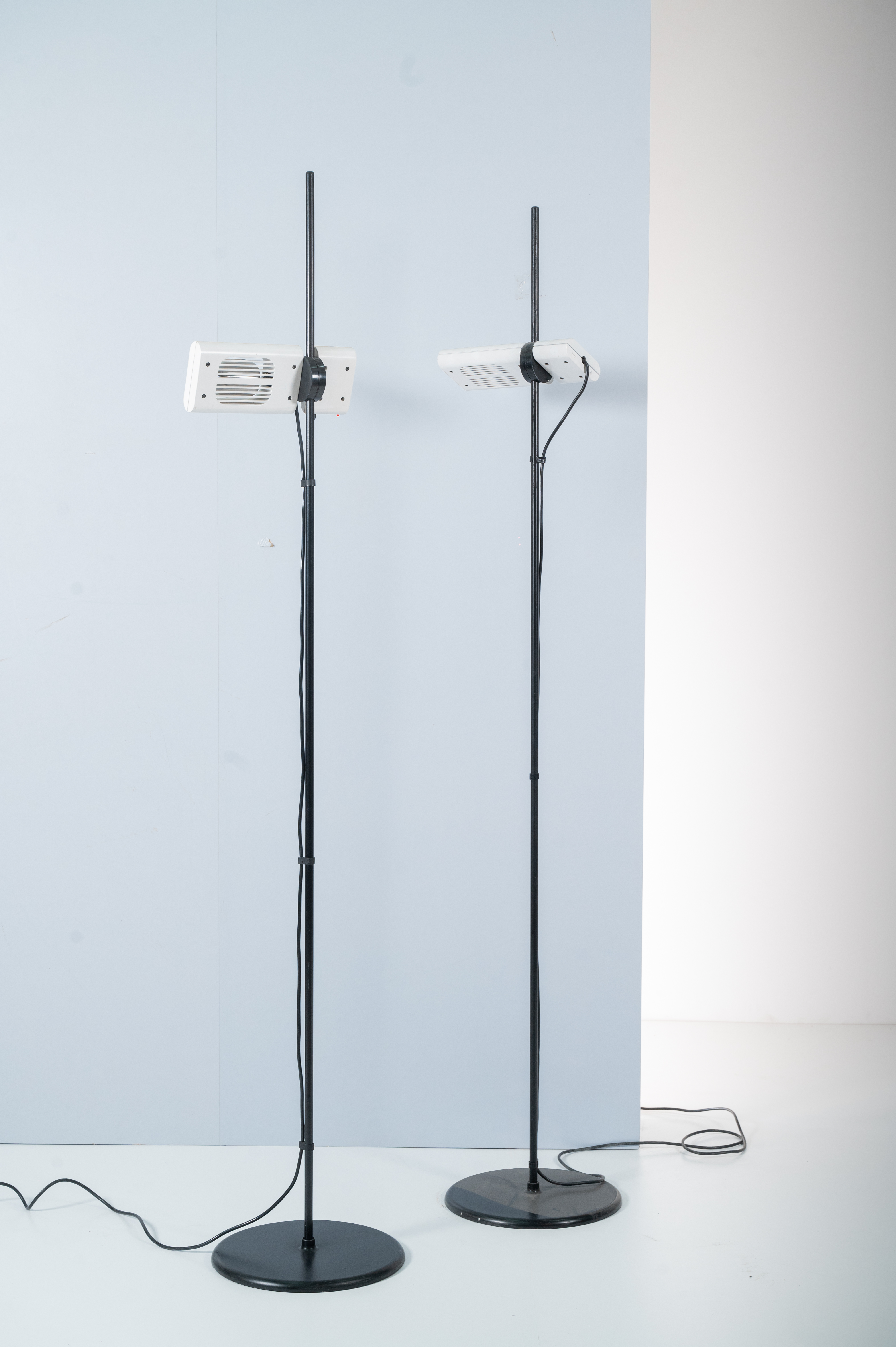Coppia di lampade da terra ad una luce modello 'Aton', struttura in metallo verniciato nero con diffusore orientabile in metallo verniciato bianco. Base circolare verniciata nera. Marchio di produzione.