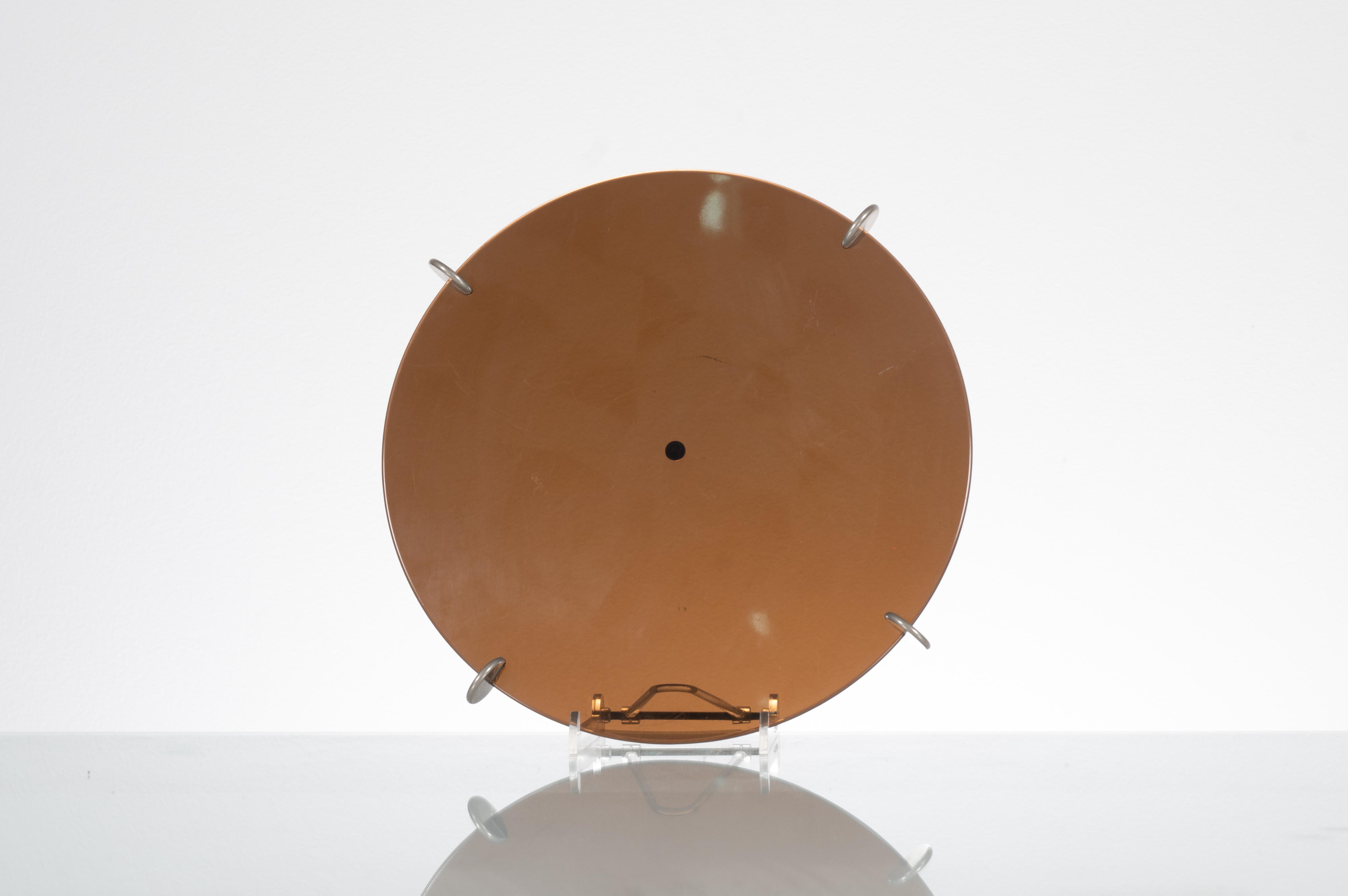 Centrotavola circolare in plexiglass fumé, piedi circolari in acciaio cromato. Marchio di produzione incusso. Lievi graffi.