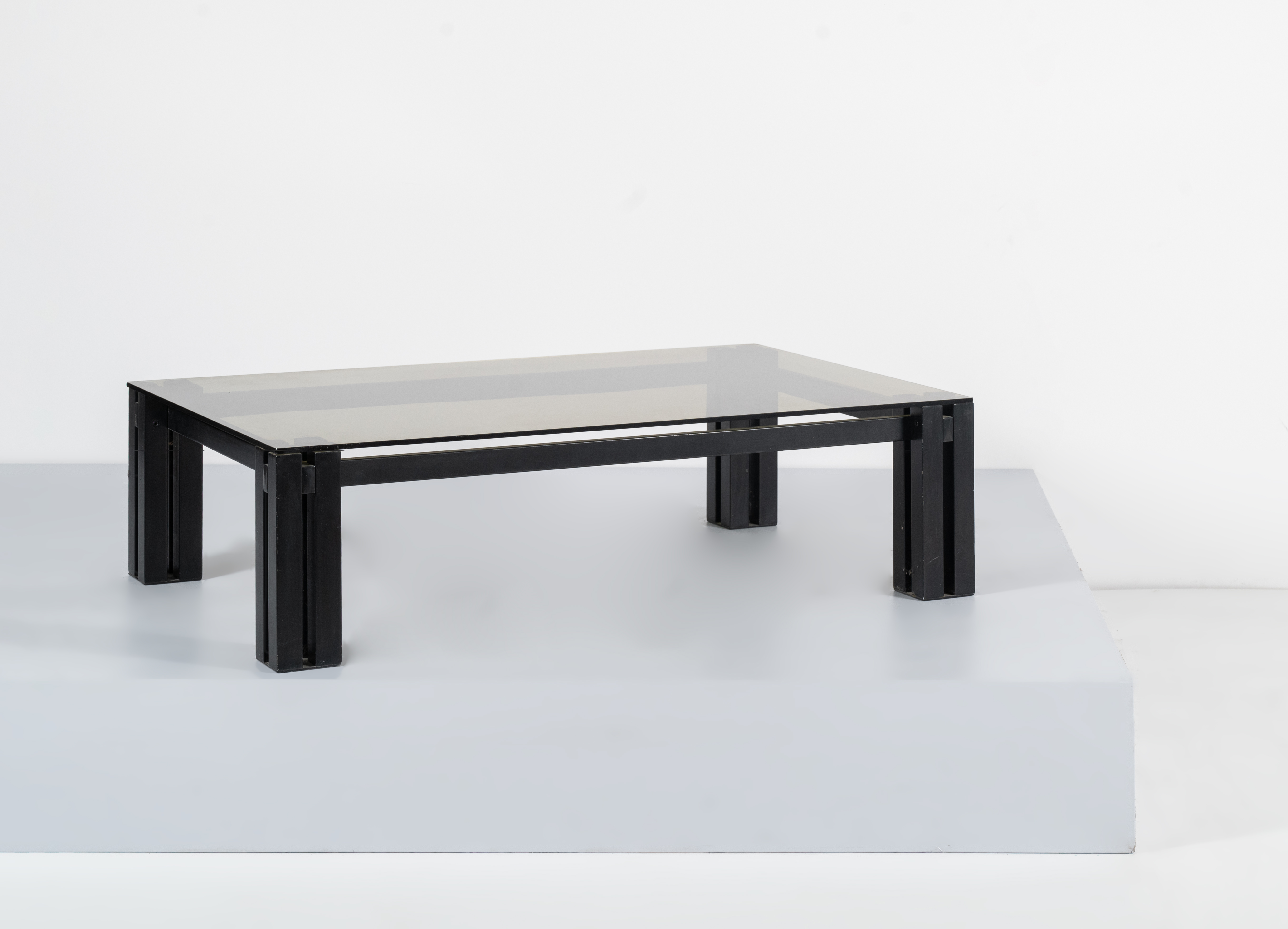 Tavolo da salotto con struttura in metallo verniciato nero, piano rettangolare in vetro fumé.