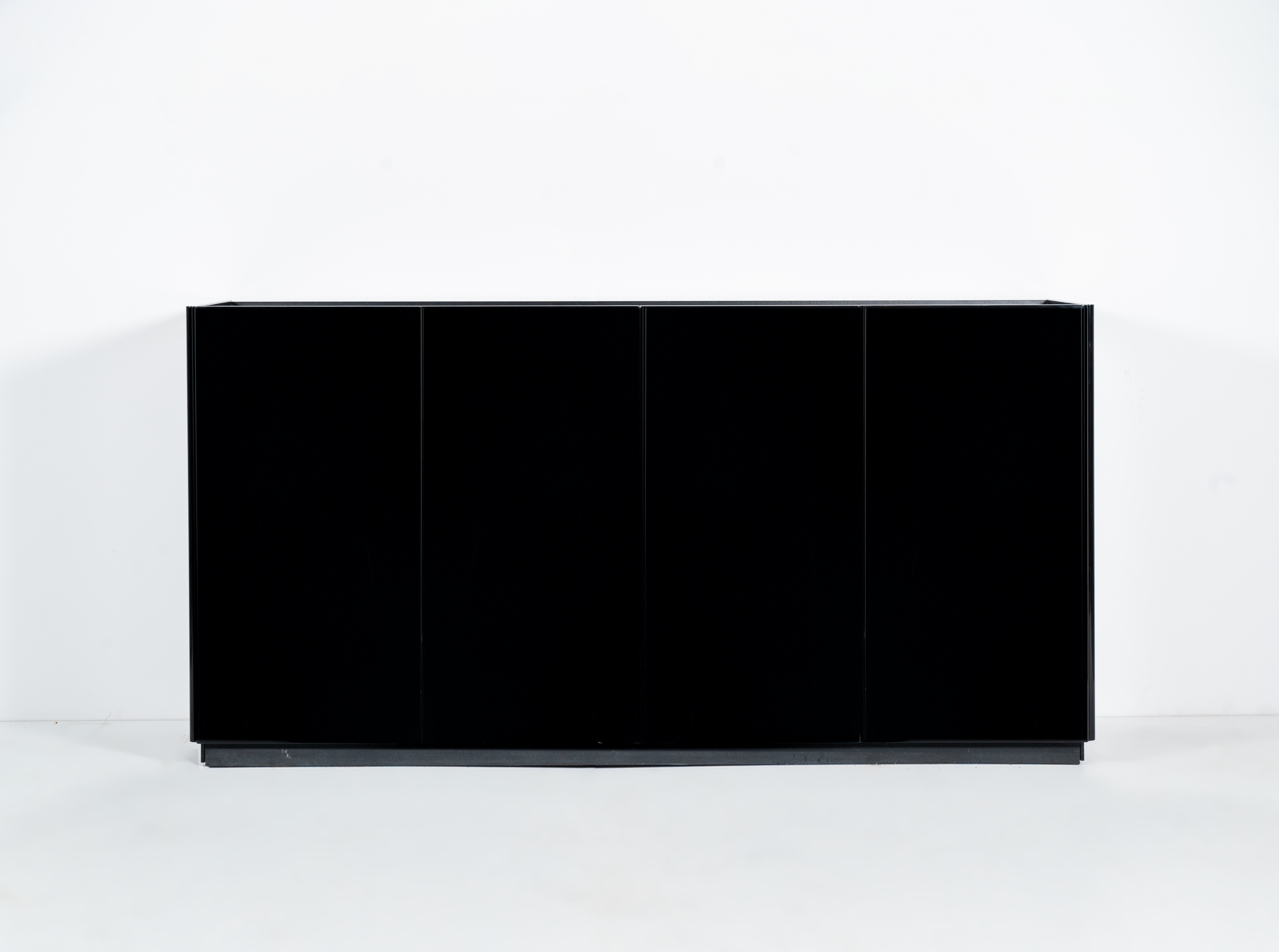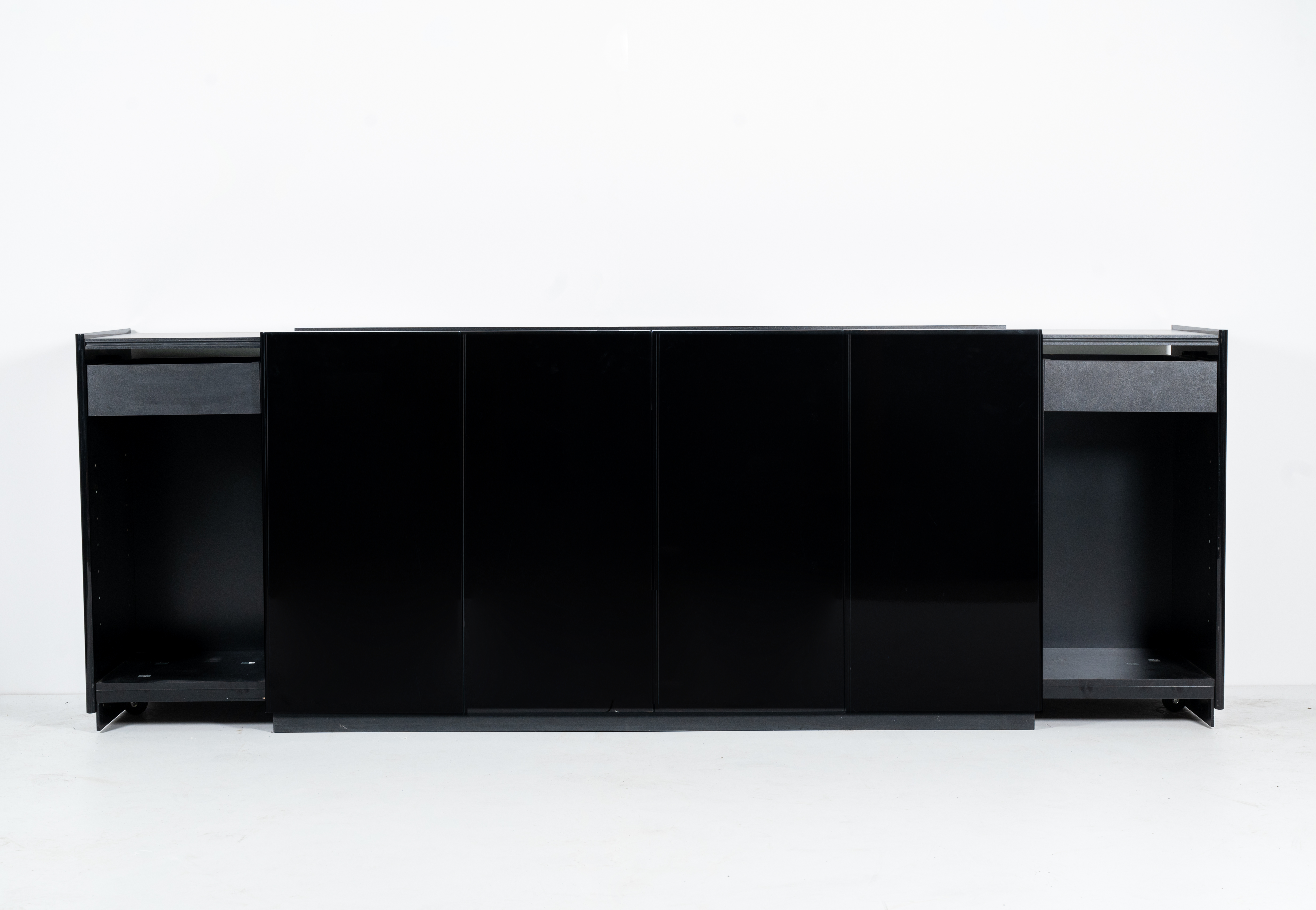 Sideboard in legno laccato nero lucido ed opaco, piano rettangolare, sul fronte un vano chiuso con due ante a battente con mensole in legno e vetro, fianchi scorrevoli con cassetto e vano a giorno. Lieve graffio sul fianco.