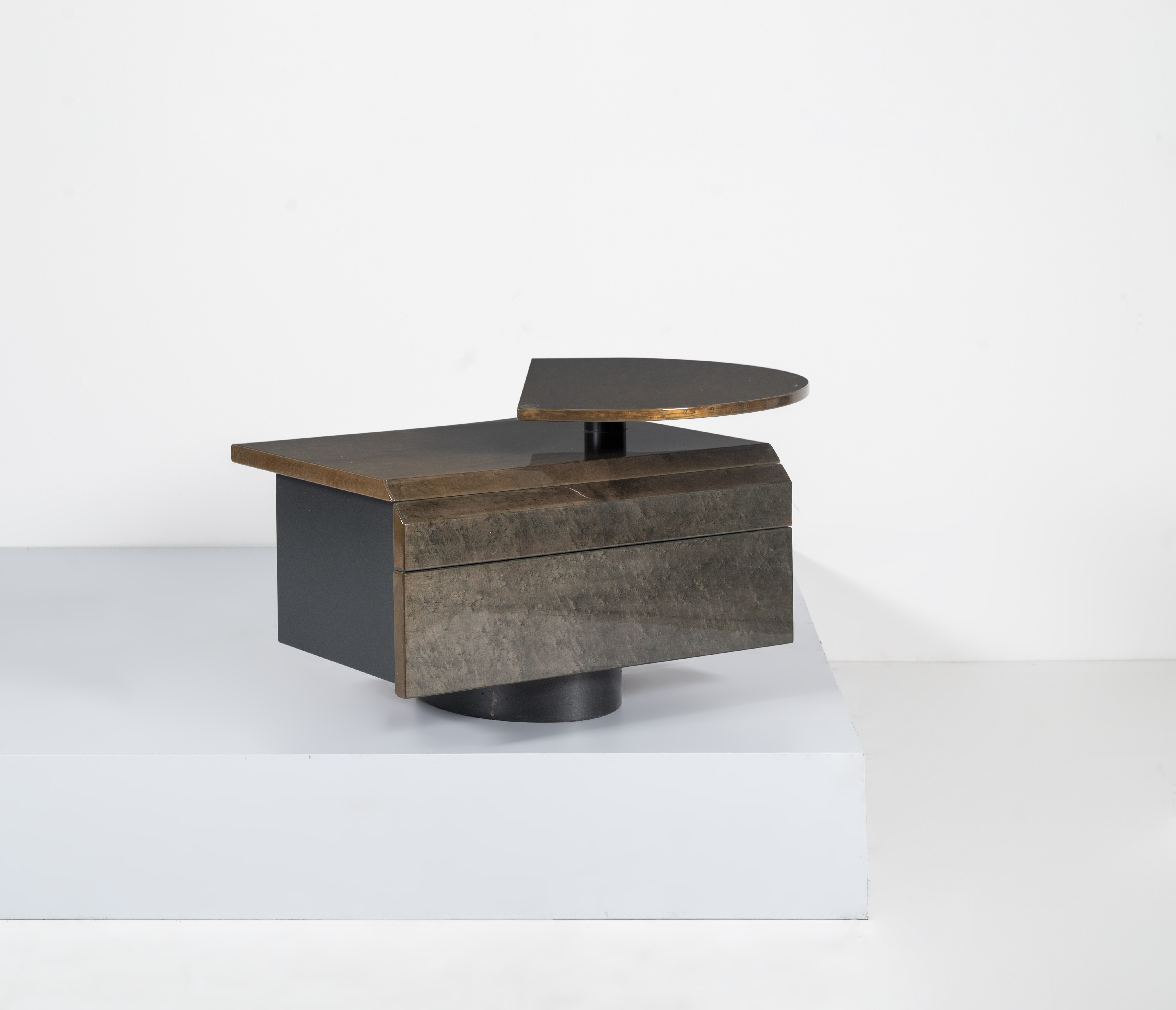 Comodino in legno tinto verde in essenza, piano rettangolare con piano semicircolare rotante sovrapposto, sul fronte due cassetti, fianchi il legno nero laccato, piede cilindrico.