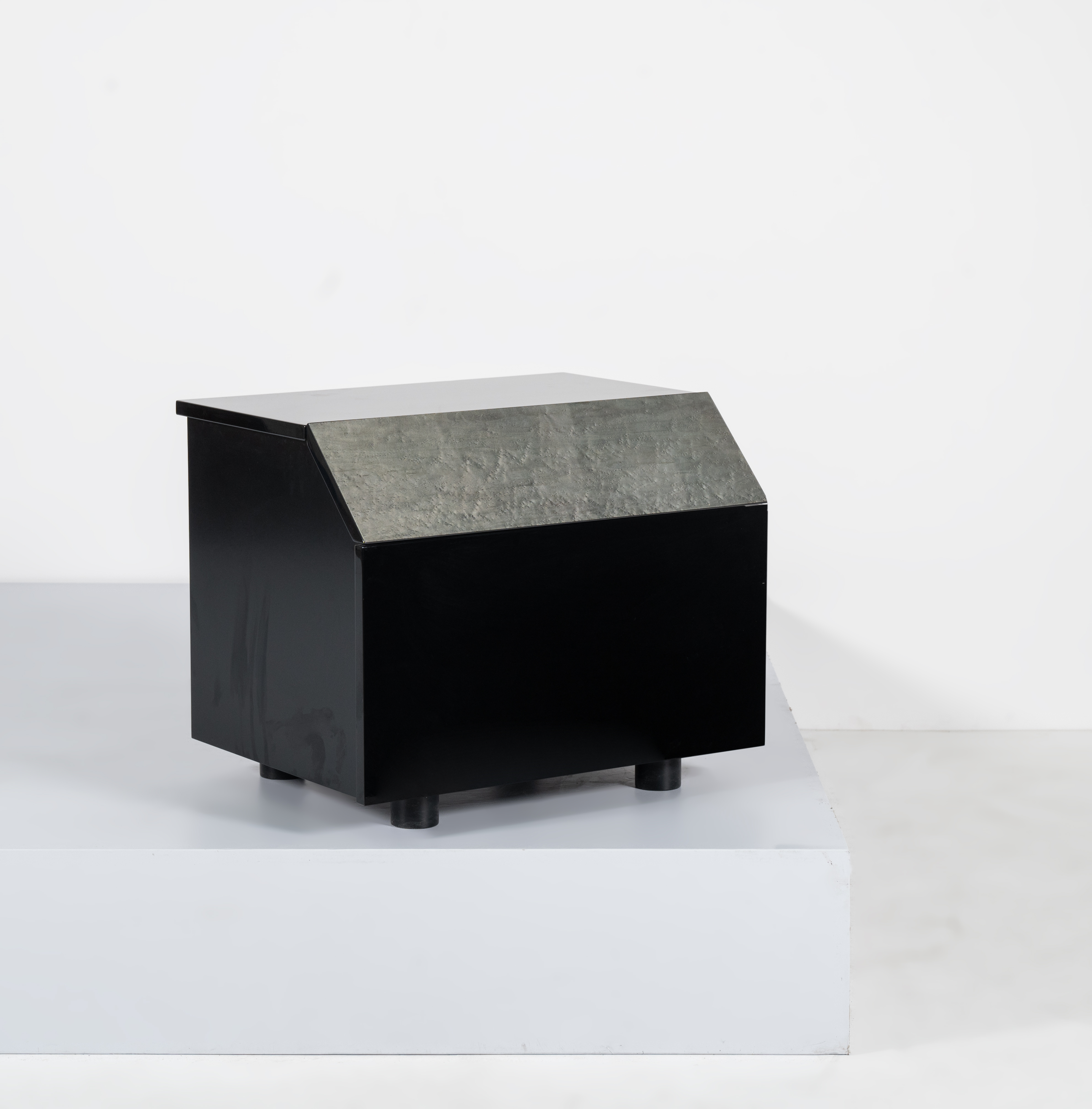 Comodino con struttura in legno, piano rettangolare in legno nero laccato lucido, cassetto diagonale in acero tinto verde e cassetto sottostante in legno laccato nero lucido, fianchi in legno laccato nero opaco e piedi cilindrici.