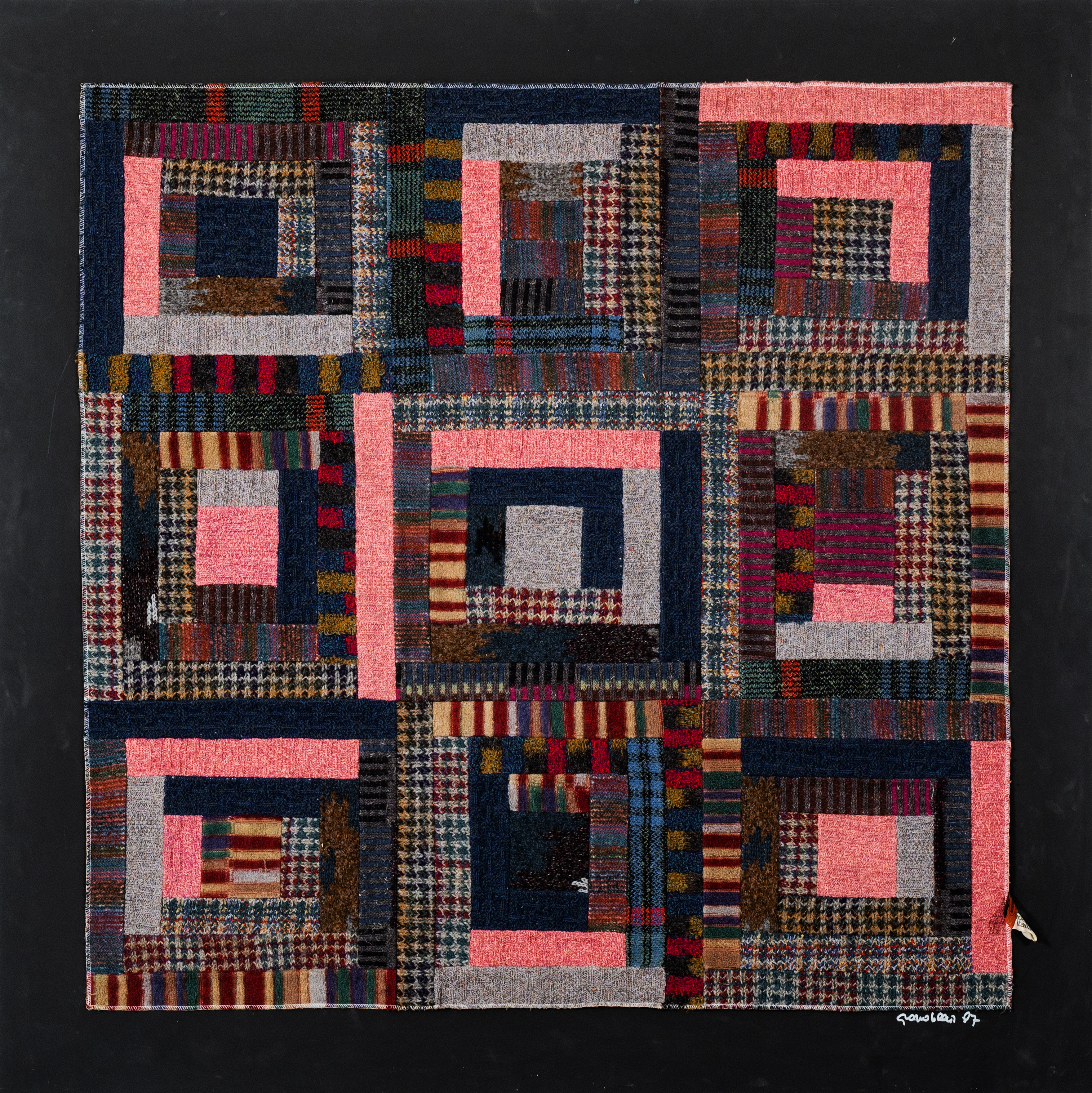 Arazzo su supporto rigido quadrato laccato nero, composto da formelle quadrate policrome tessute a telaio con decori geometrici differenti (Missoni). Etichette di produzione Missoni e Saporiti.