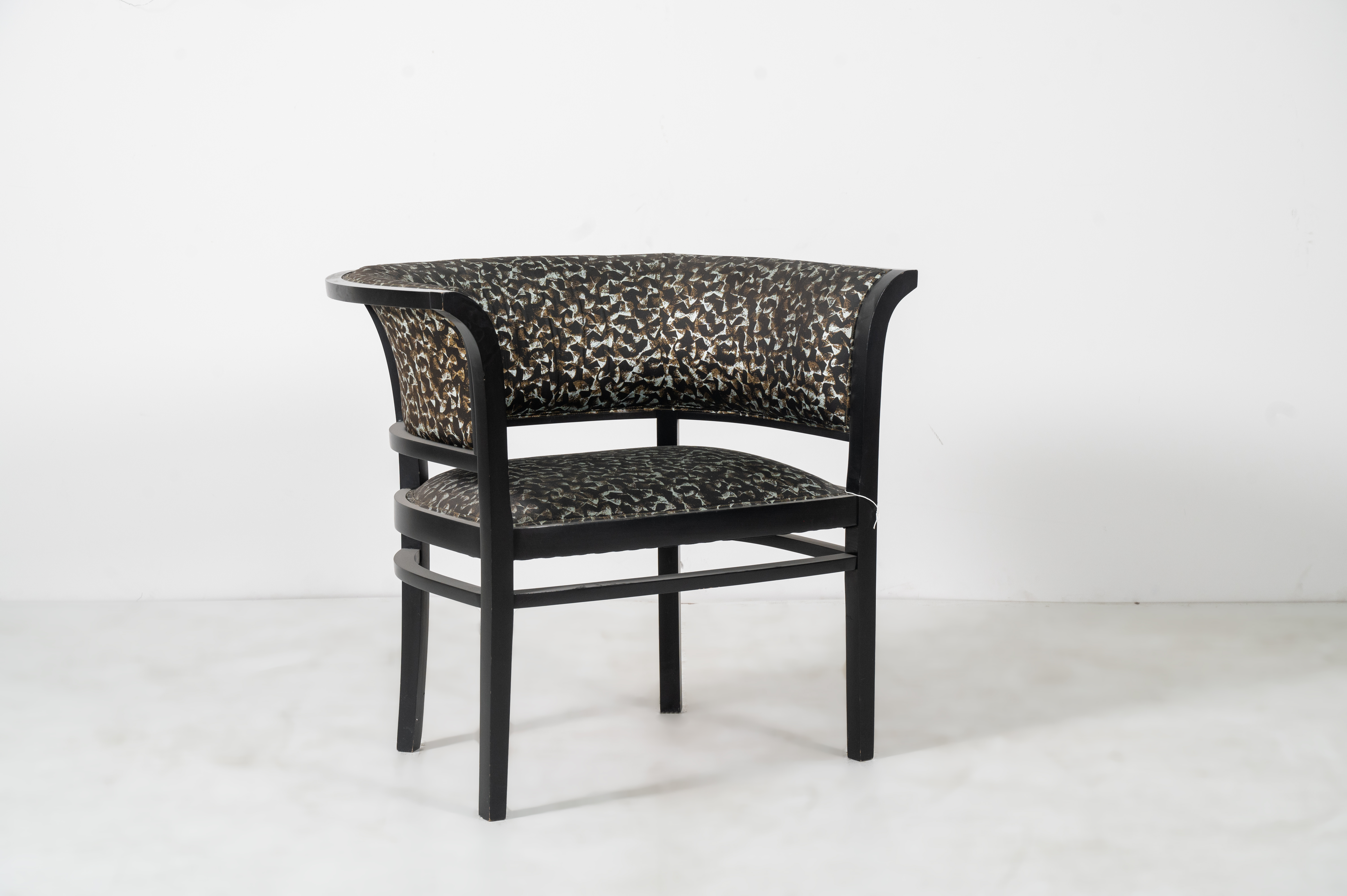 Poltrona con struttura in legno laccato nero, seduta e spalliera curvate, imbottitura e rivestimento in tessuto nero a decoro astratto marrone e bianco.