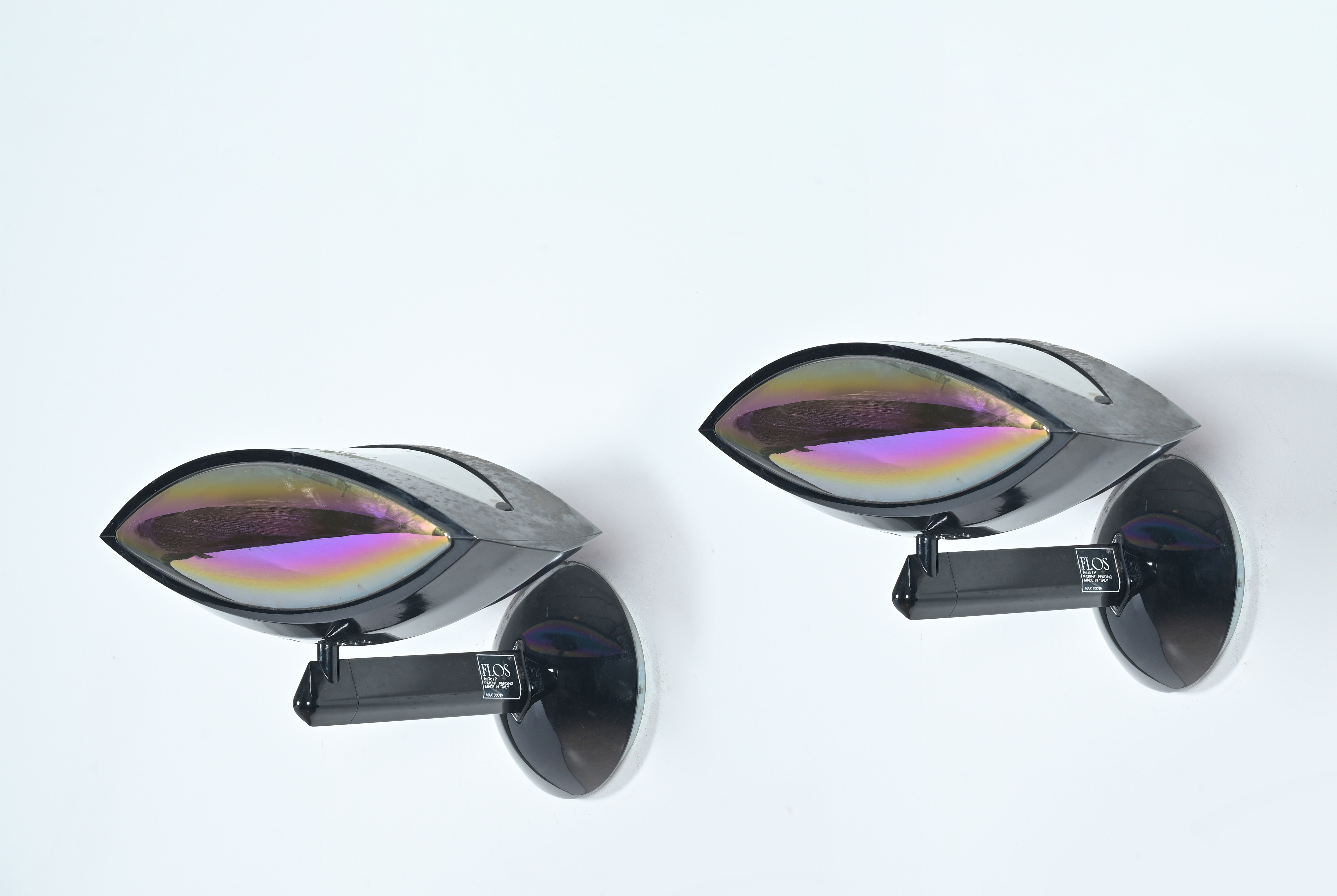 Coppia di lampada da parete ad una luce modello 'AeTo/P', struttura in alluminio pressofuso verniciato nero, diffusore ellittico in vetro. Etichetta di produzione.