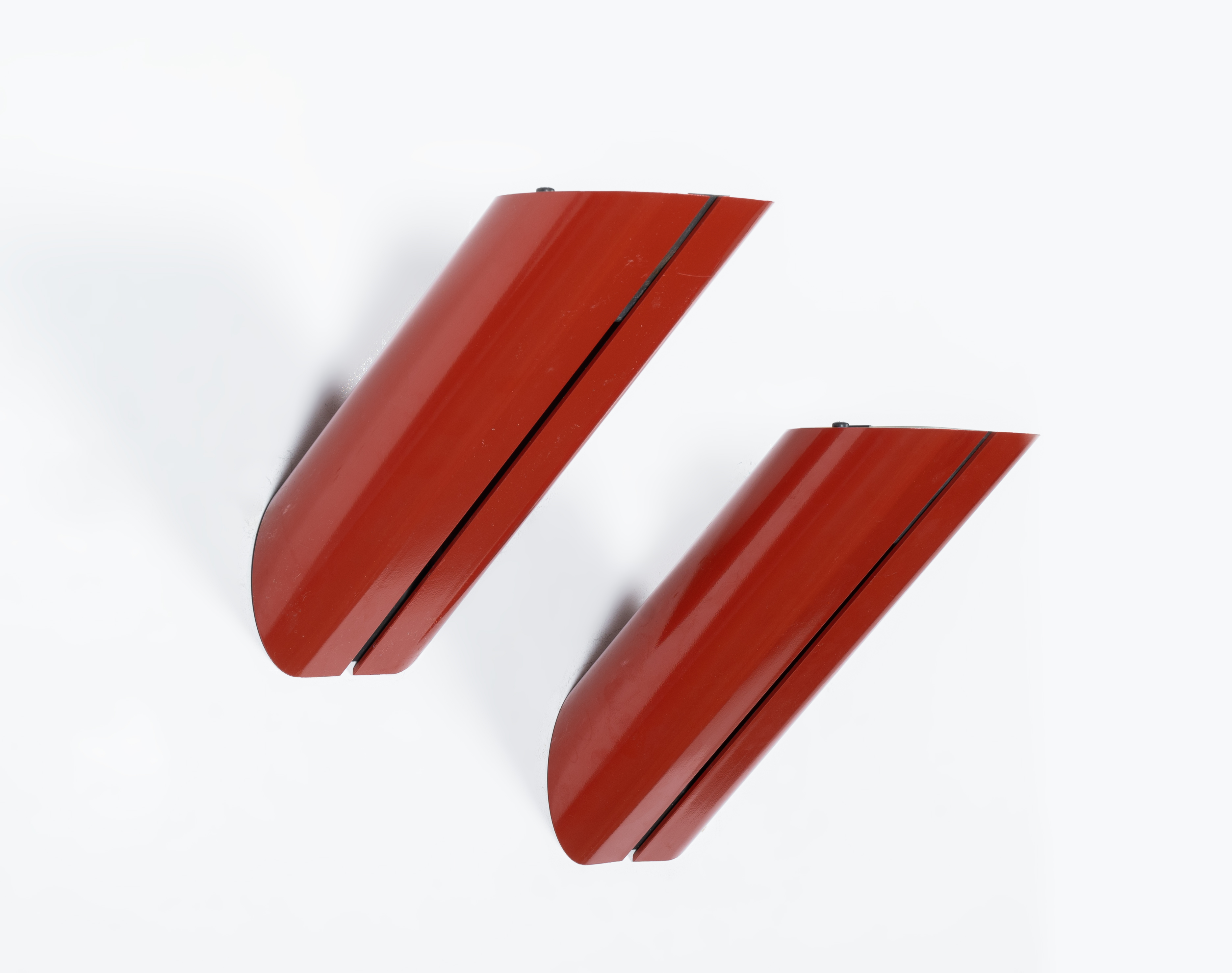 Coppia di lampade da parete ad una luce modello 'Megaron', struttura in metallo curvato e laccato rosso, diffusore con vetro rettangolare. Etichetta di produzione.