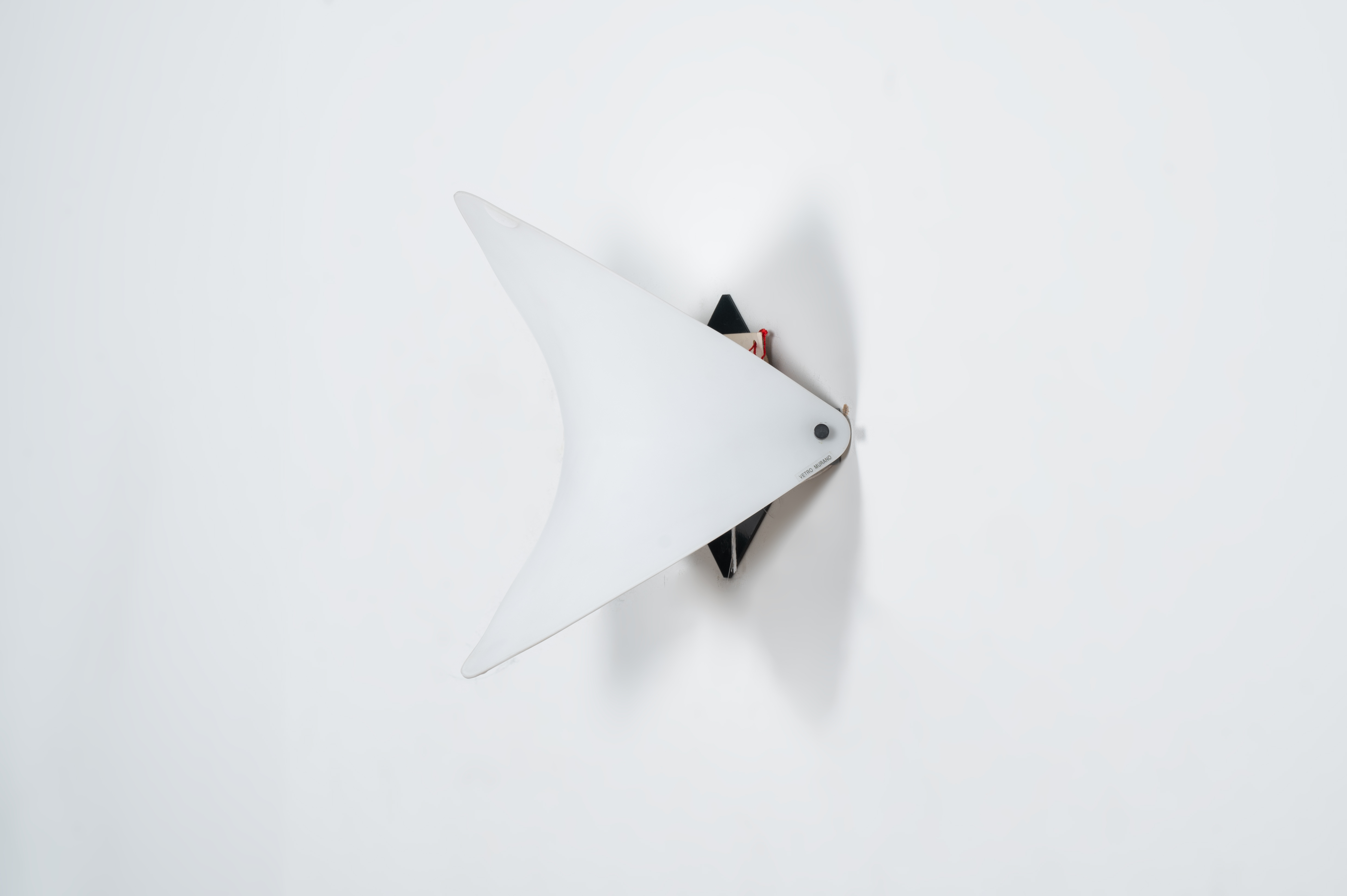 Lampada da parete ad una luce modello 'Randa', struttura in metallo verniciato nero, diffusore in vetro ricurvo a vela satinato bianco. Etichetta di produzione.
