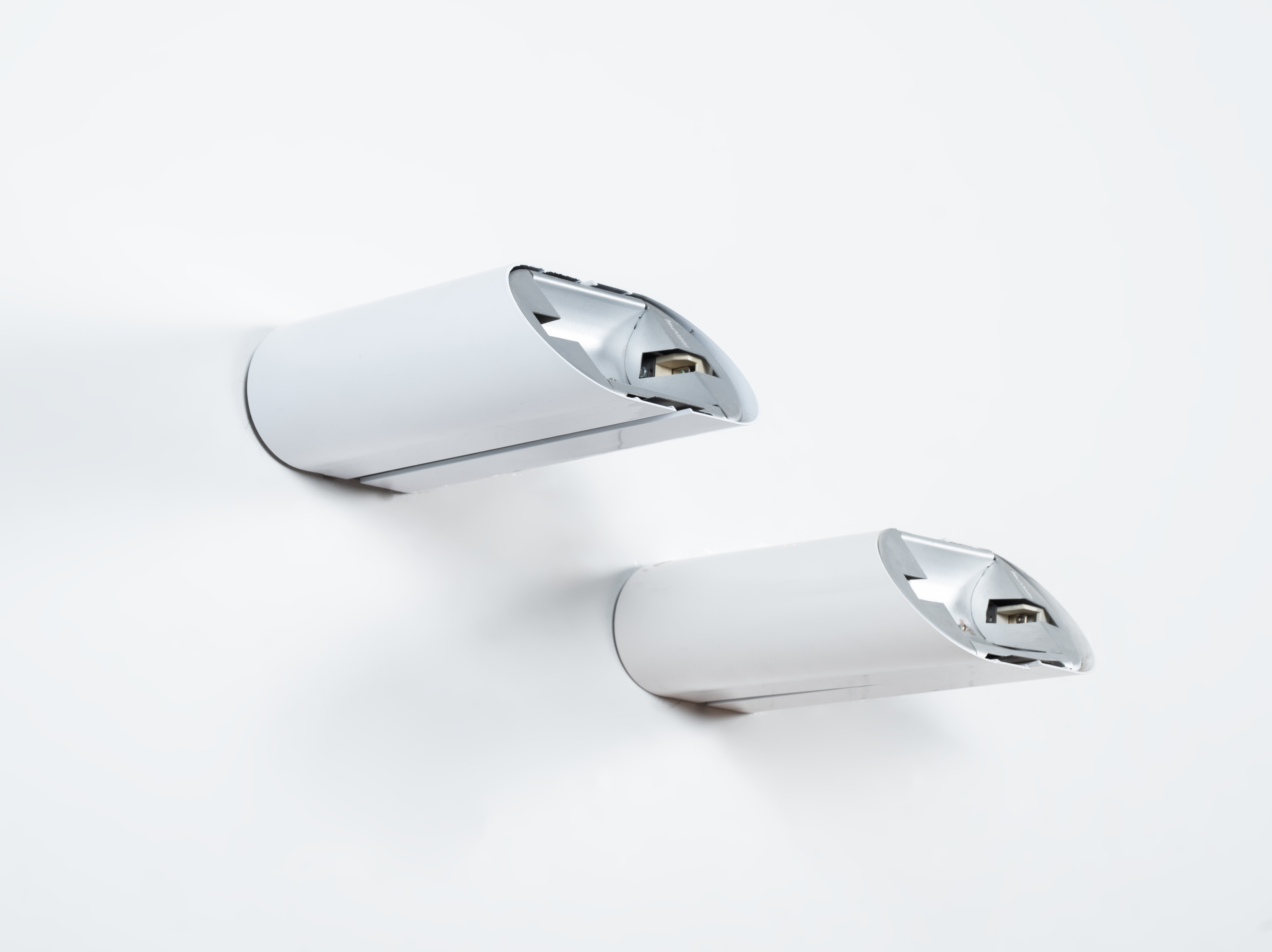 Due lampade da parete ad una luce modello 'Megaron', struttura in metallo curvato e laccato nei toni del bianco, Etichetta di produzione.