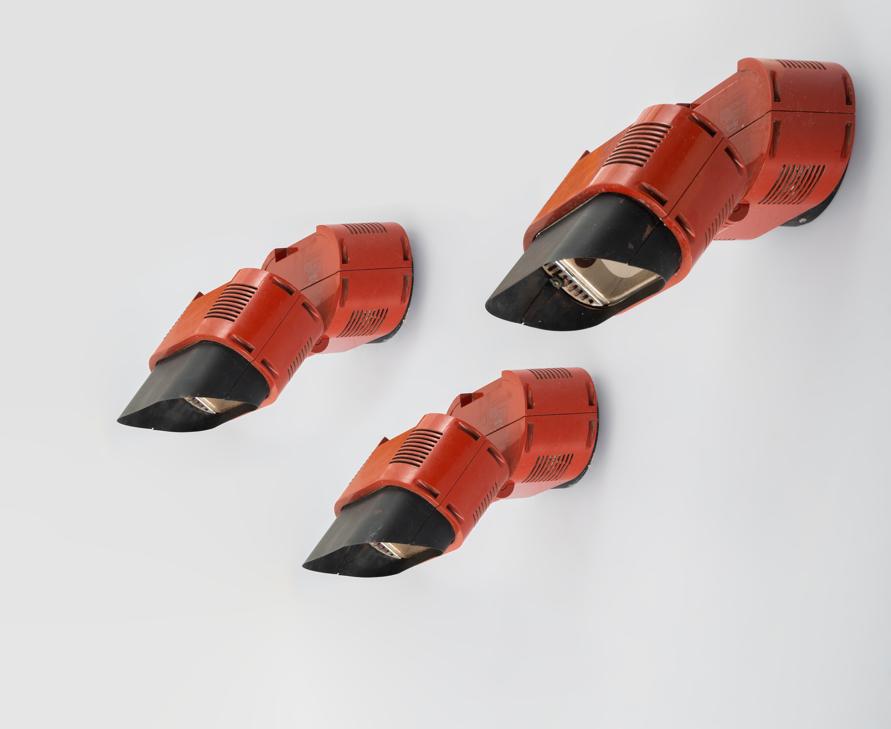 Tre lampade da parete ad una luce modello 'Giove' con struttura in metallo verniciato rosso, diffusore in metallo verniciato nero e vetro. Marchio di produzione.