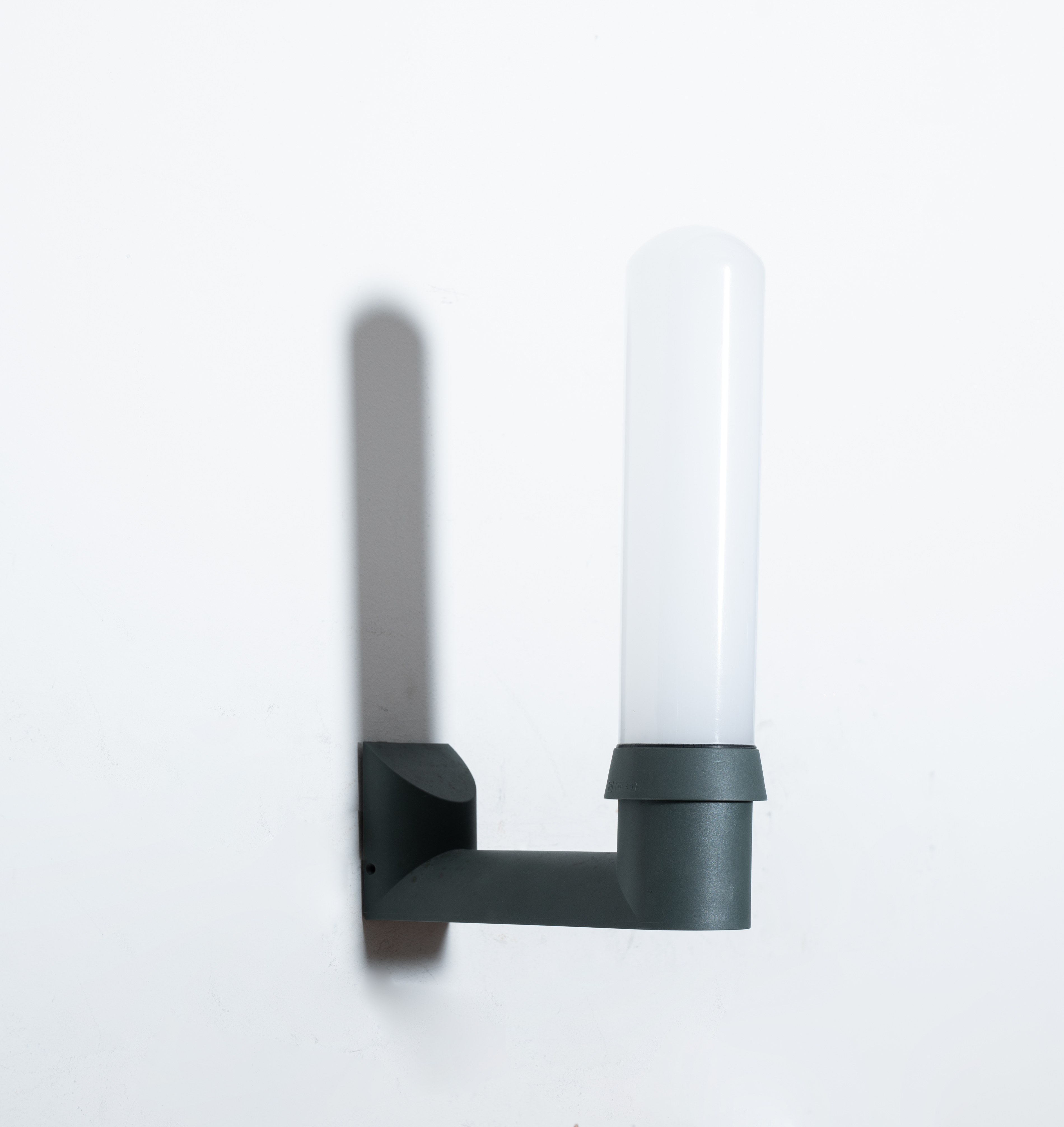 Lampada da parete per esterni ad una luce, struttura in abs, metallo, diffusore cilindrico in vedril traslucido.