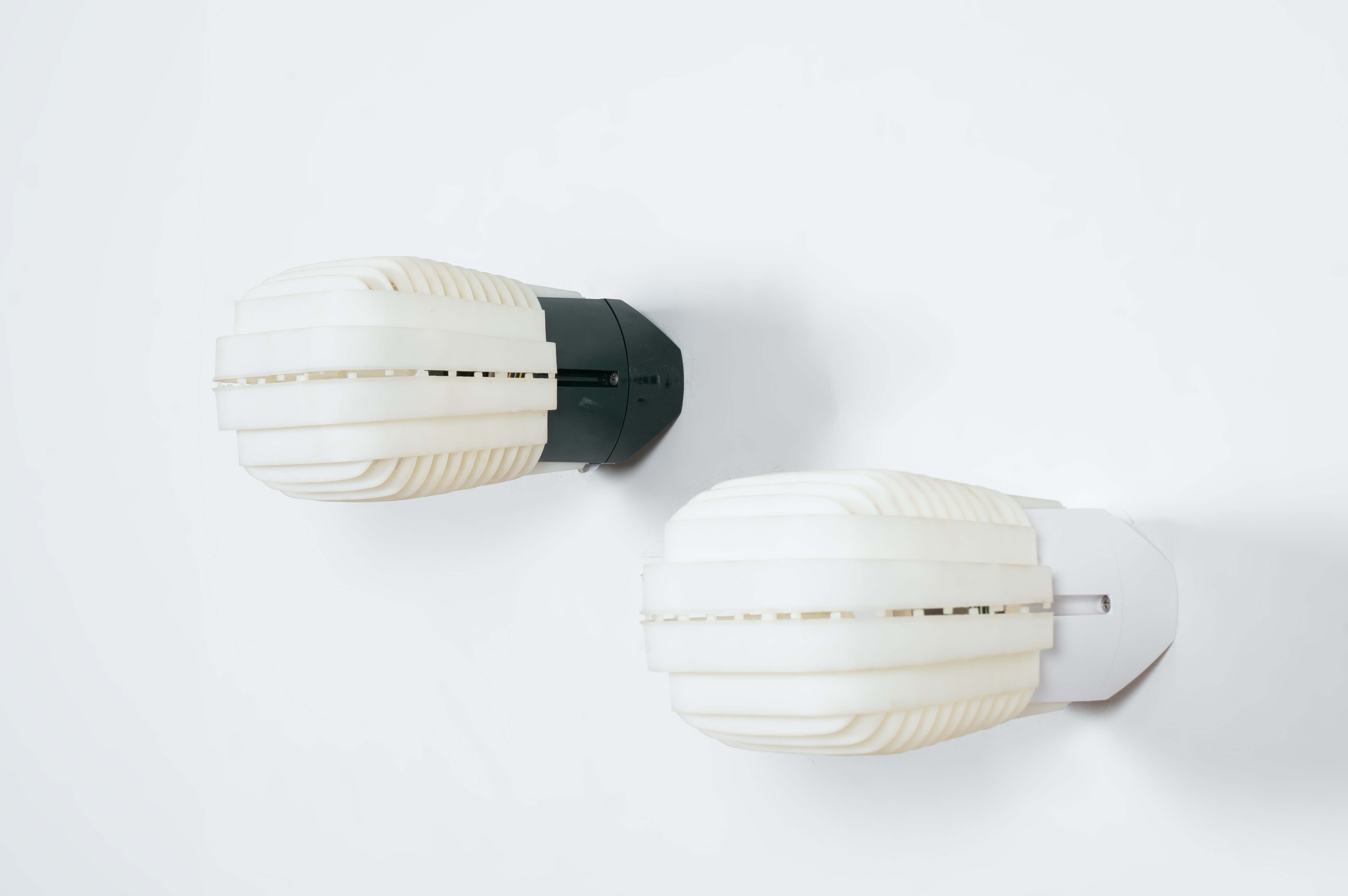 Due lampade da parete ad una luce modello “Joe”, una con struttura in plastica verde e diffusore in plastica bianca, una con struttura e diffusore in plastica bianca. Marchio di produzione.