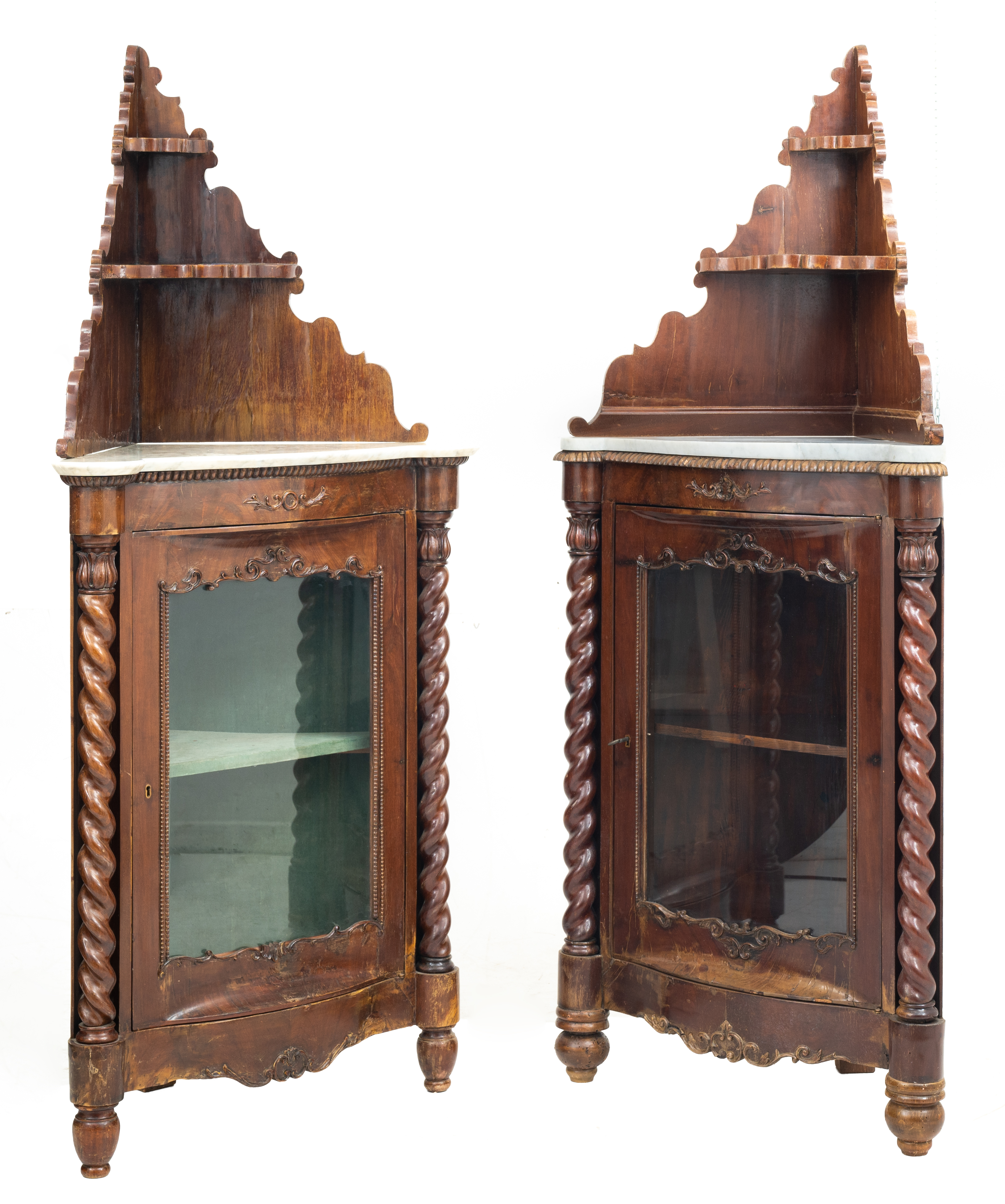 Coppia di angoliere con alzata Luigi Filippo in legno di mogano e piuma di mogano, piano in marmo bianco.