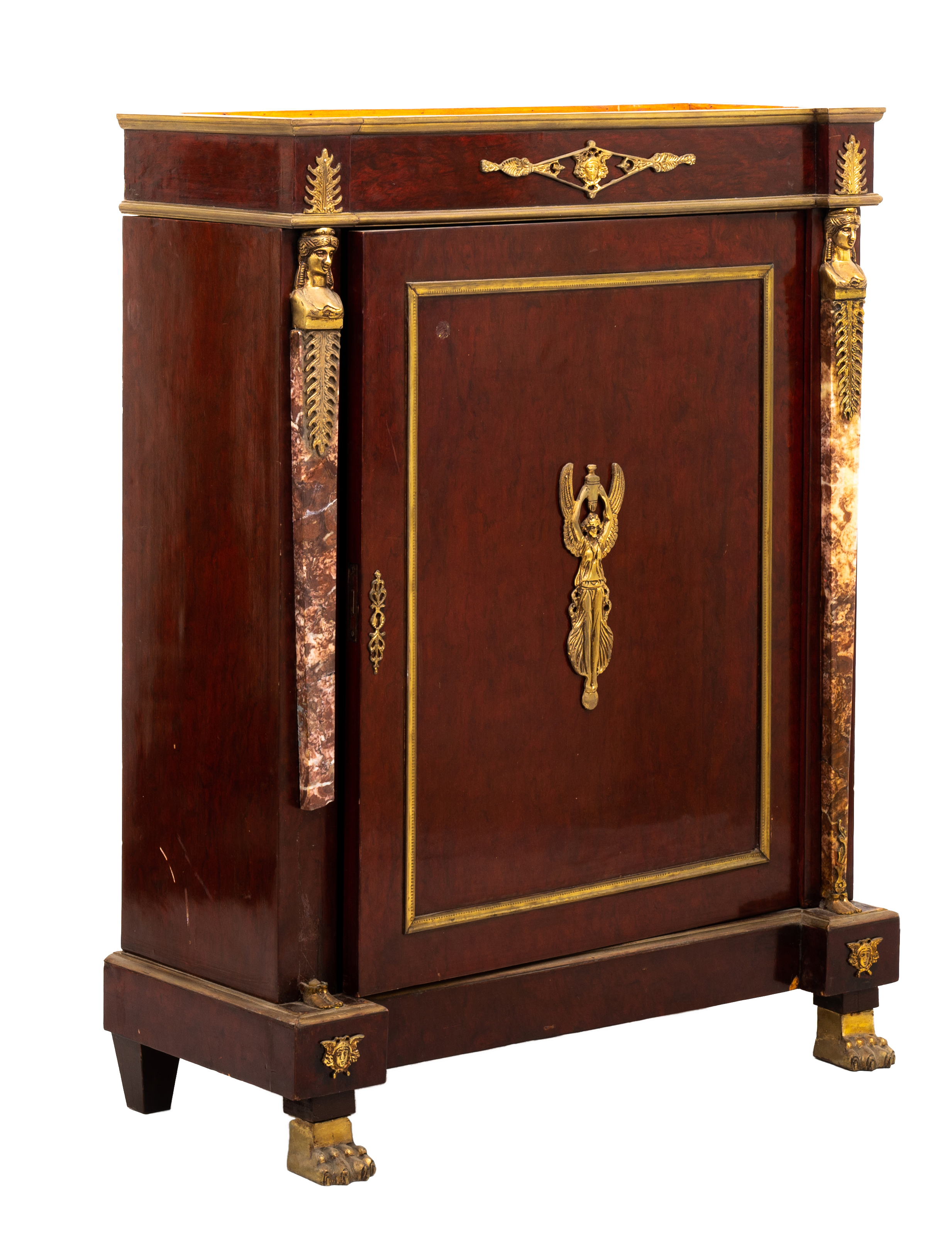 Piccola credenza stile Impero in legno di mogano, elementi in bronzo, piano in marmo rosso venato (marmo da incollare).