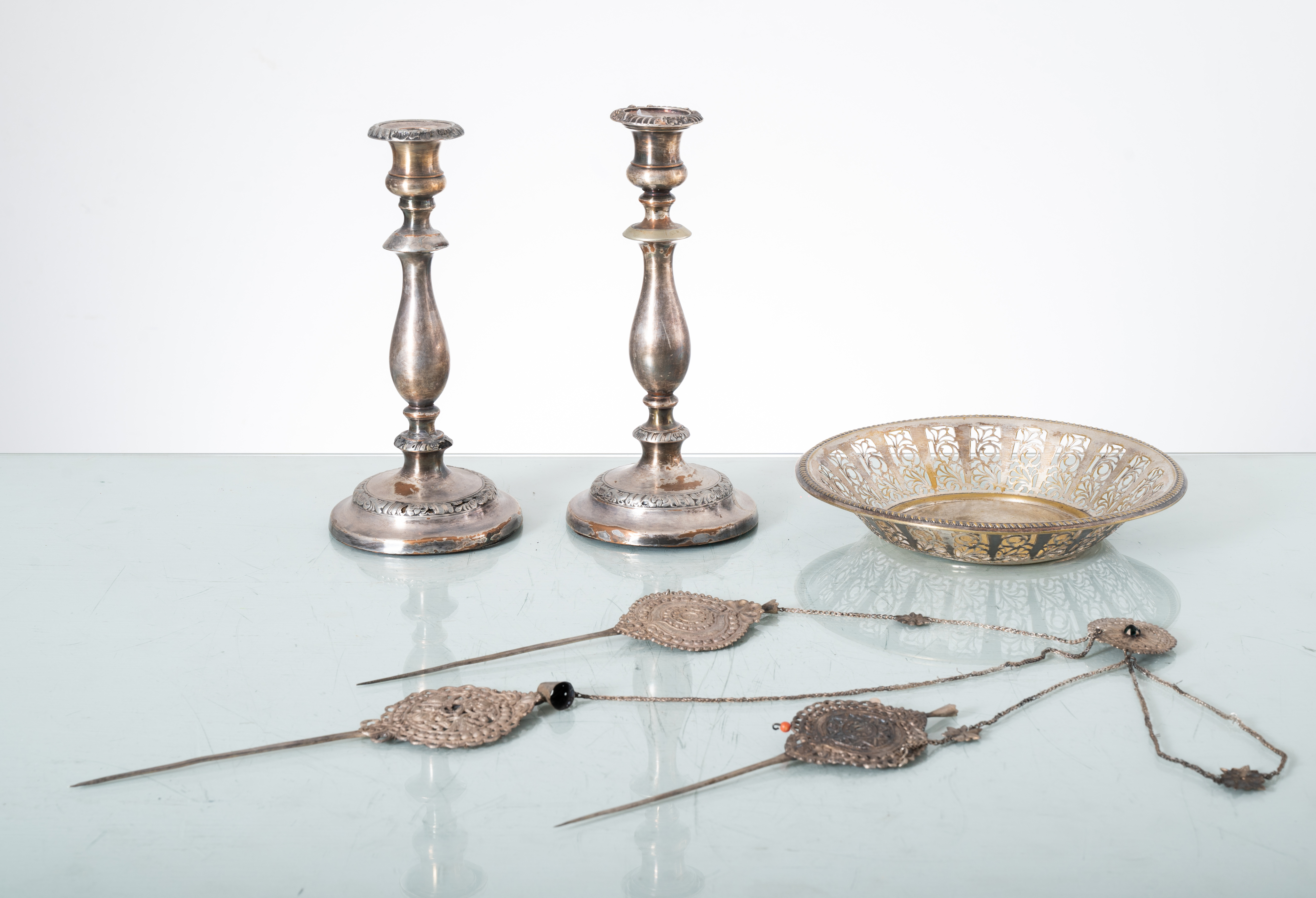 Coppia di monocera, cestino e tre spilloni in metallo argentato.