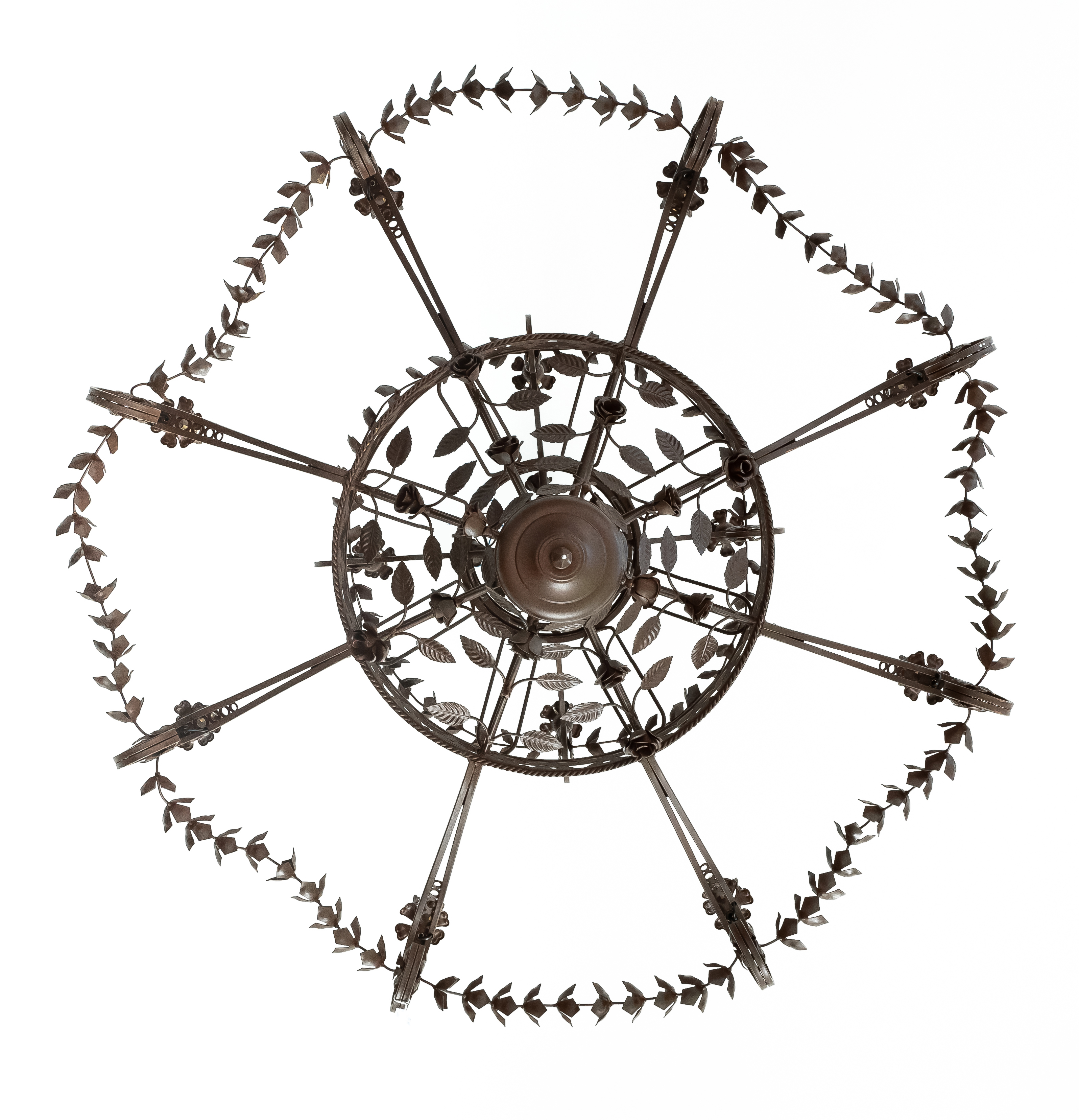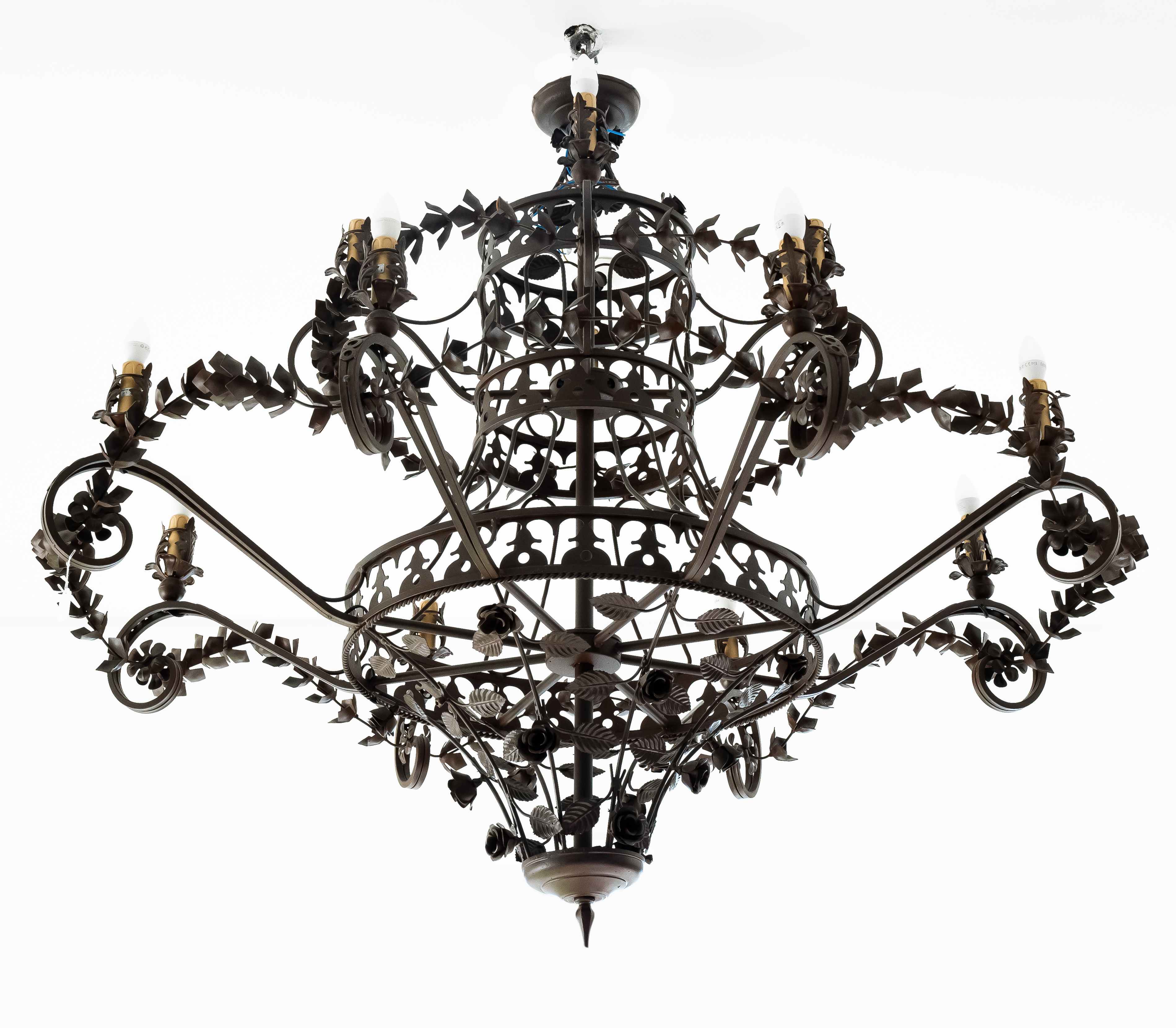 LAMPADARIO a dodici luci in ferro dipinto a mongolfiera.