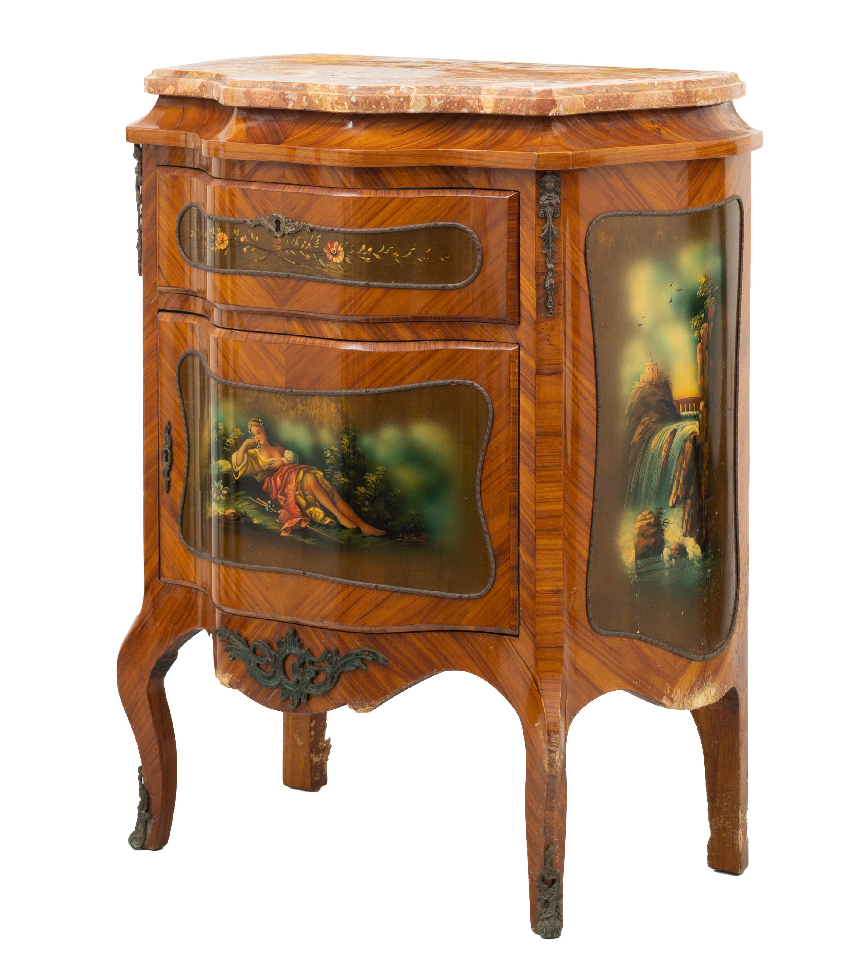 PICCOLA CREDENZA ad un'anta con cassetto in legno di noce, piano in marmo rosso venato.