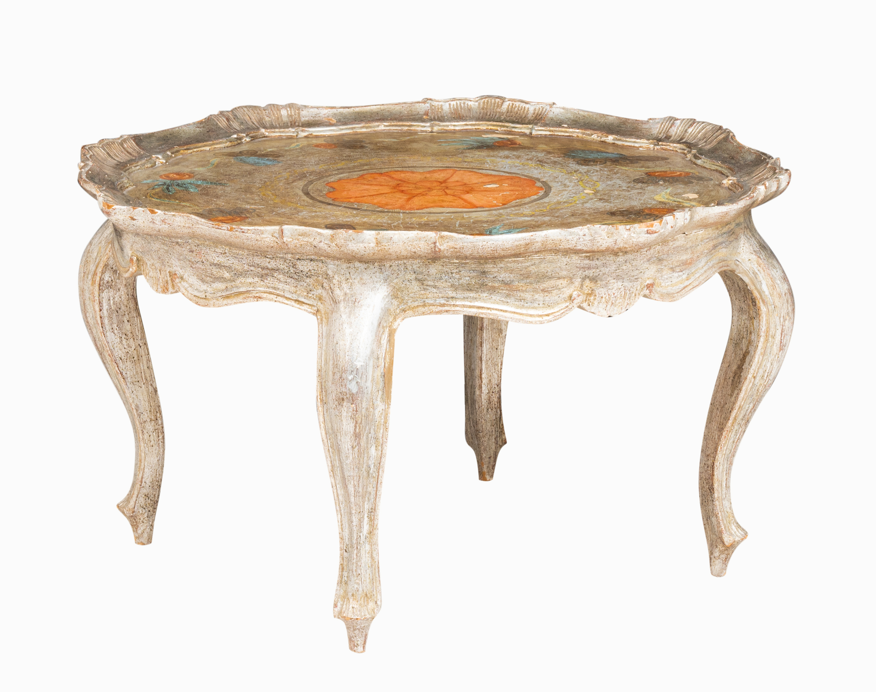 Tavolino da salotto di forma sagomata in legno argentato con decori a mano.