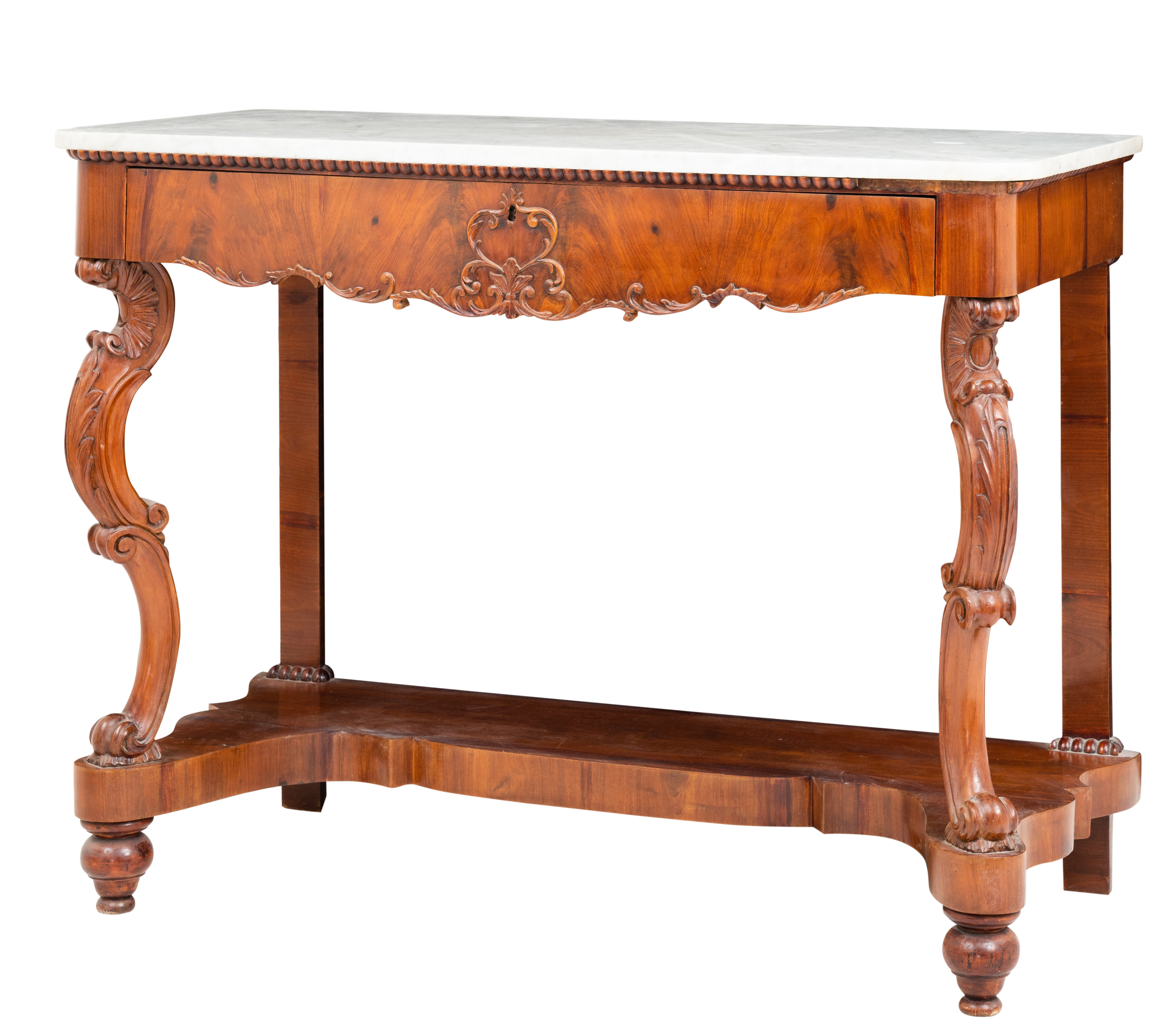 Consolle Luigi Filippo con cassetto centrale in legno di mogano e piuma di mogano, piano in marmo bianco venato.