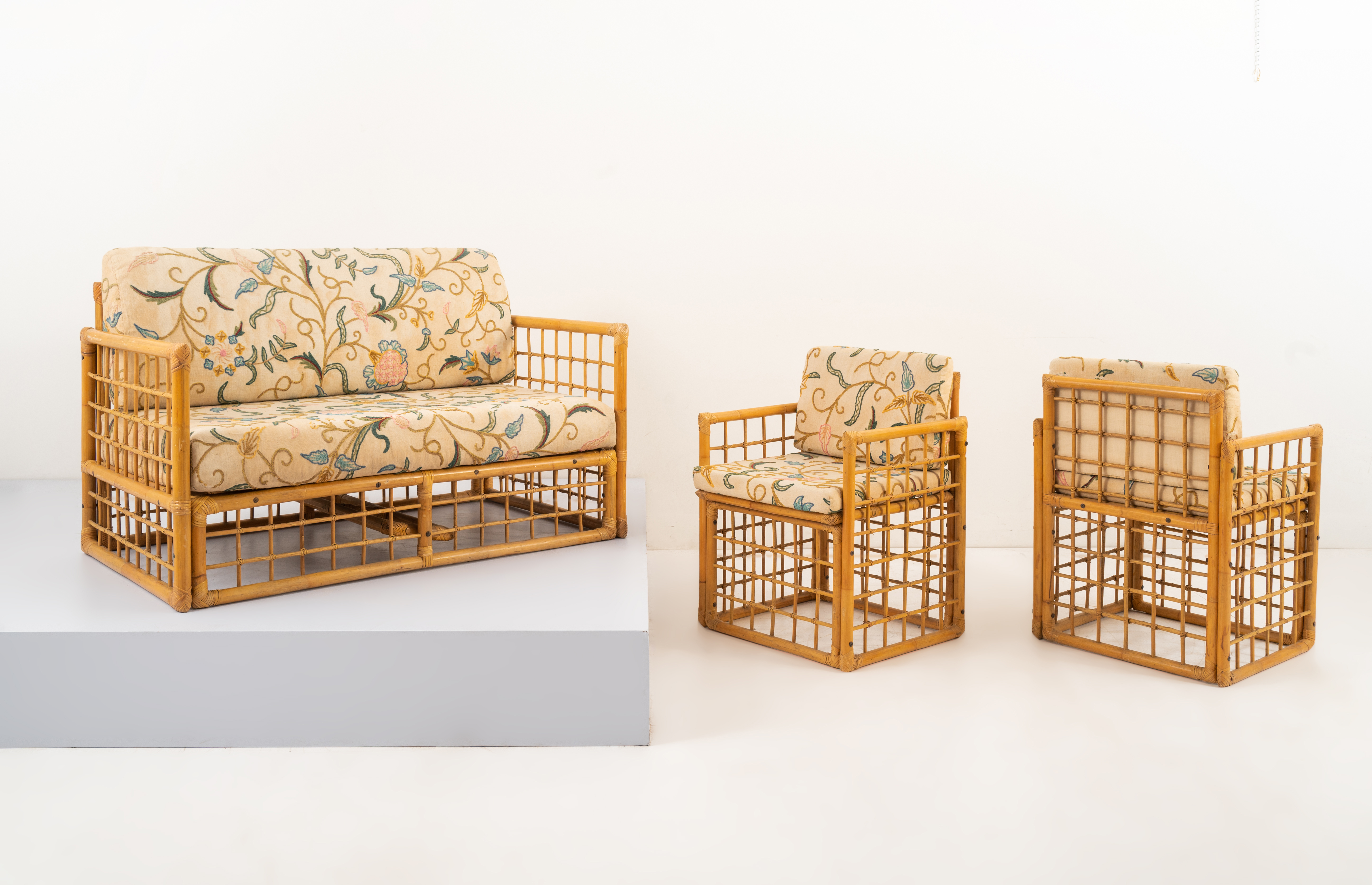 Salotto composto da divano a due posti e due poltrone, struttura in canna di bamboo e midollino, cuscini di spalliere e sedute in tessuto avorio decorato con tralci fioriti policromi.