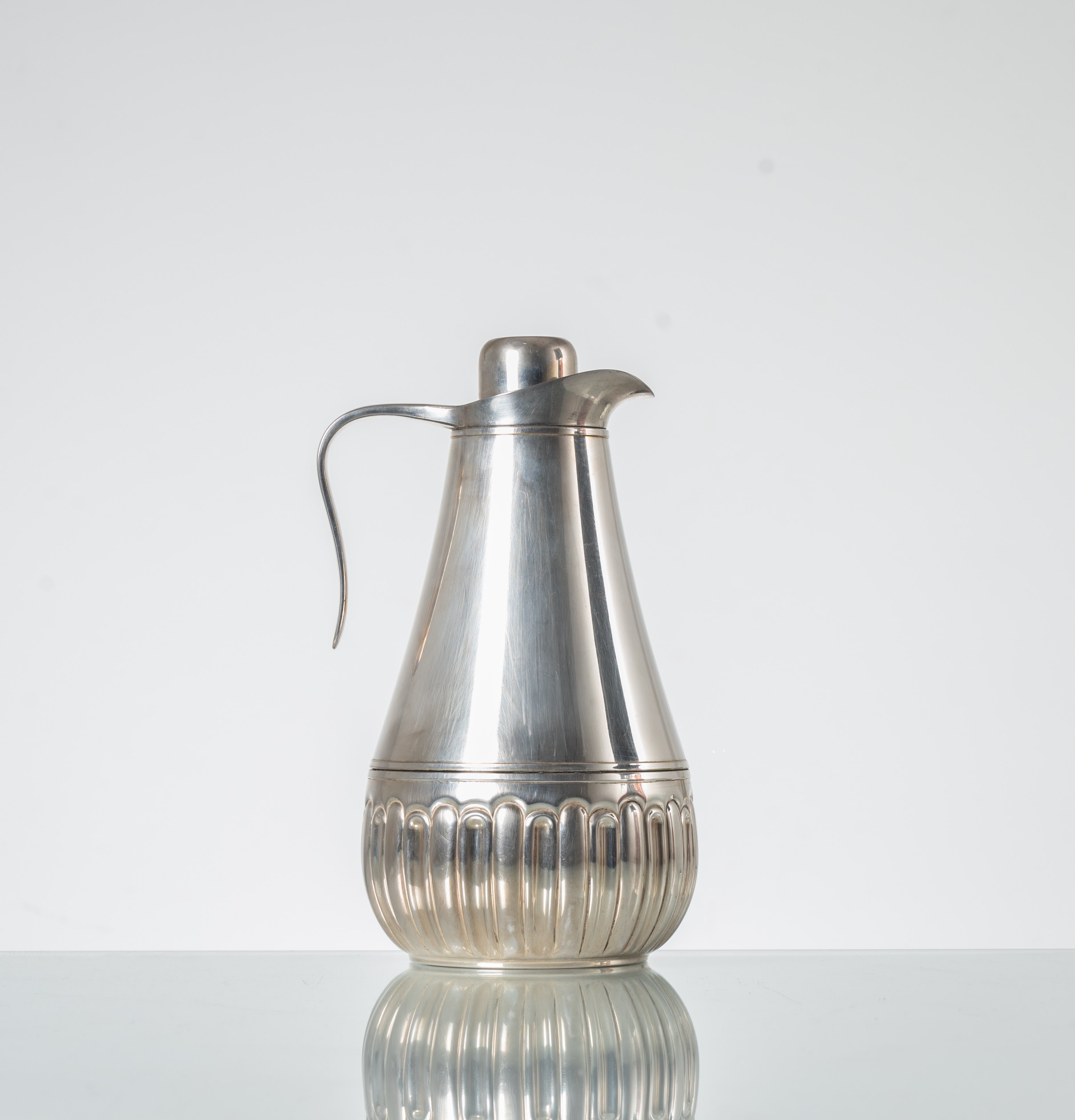 Caraffa termica in metallo argentato, corpo a goccia con decoro inferiore a baccellature. Rivestimento termico in vetro specchiato. Marchio di produzione. Segni di uso.