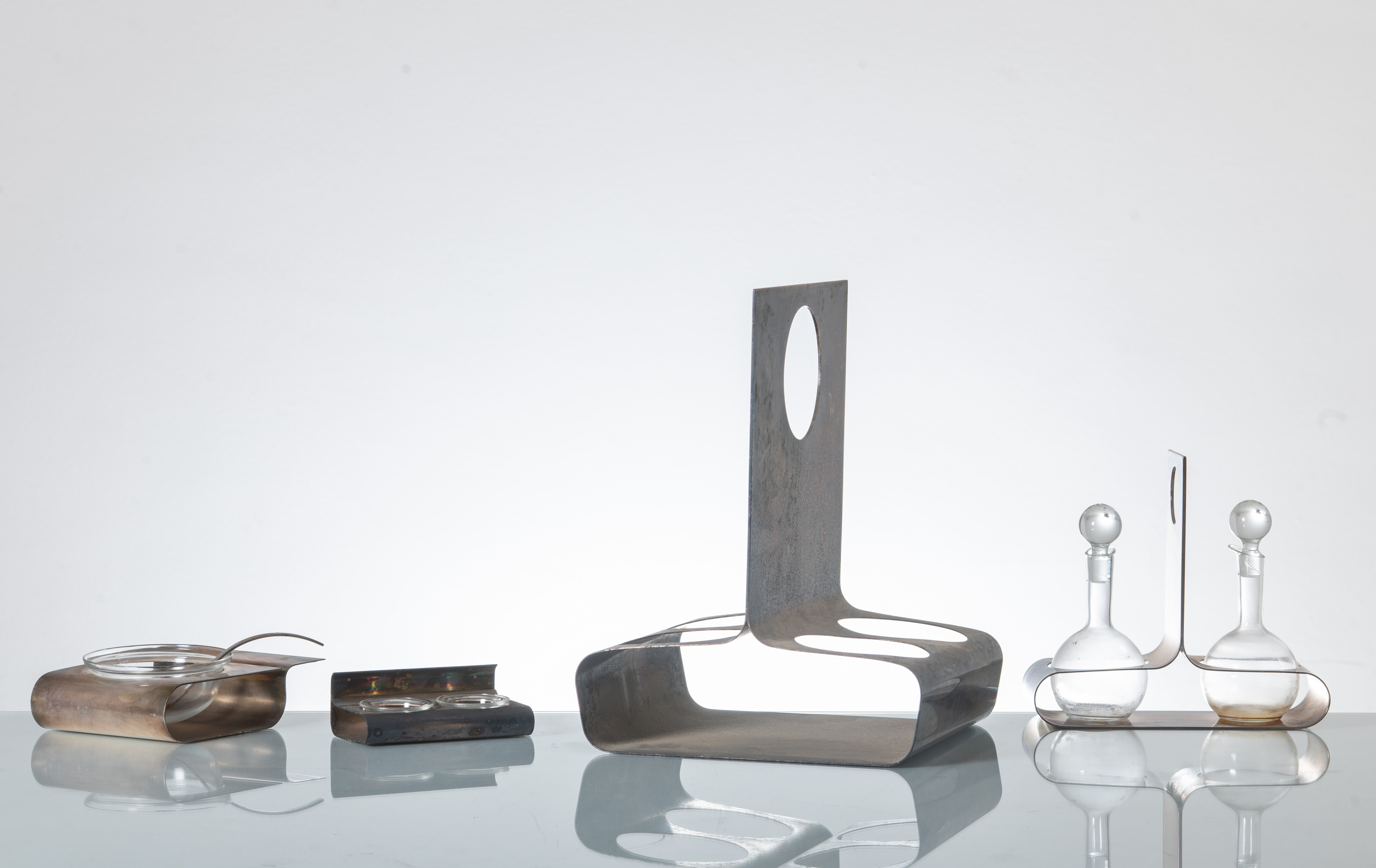 Quattro complementi tavola in metallo argentato e vetro composti da una formaggiera, un sale e pepe, un ménage con ampolle in vetro ed un portabottiglie da vino. Marchio di produzione.