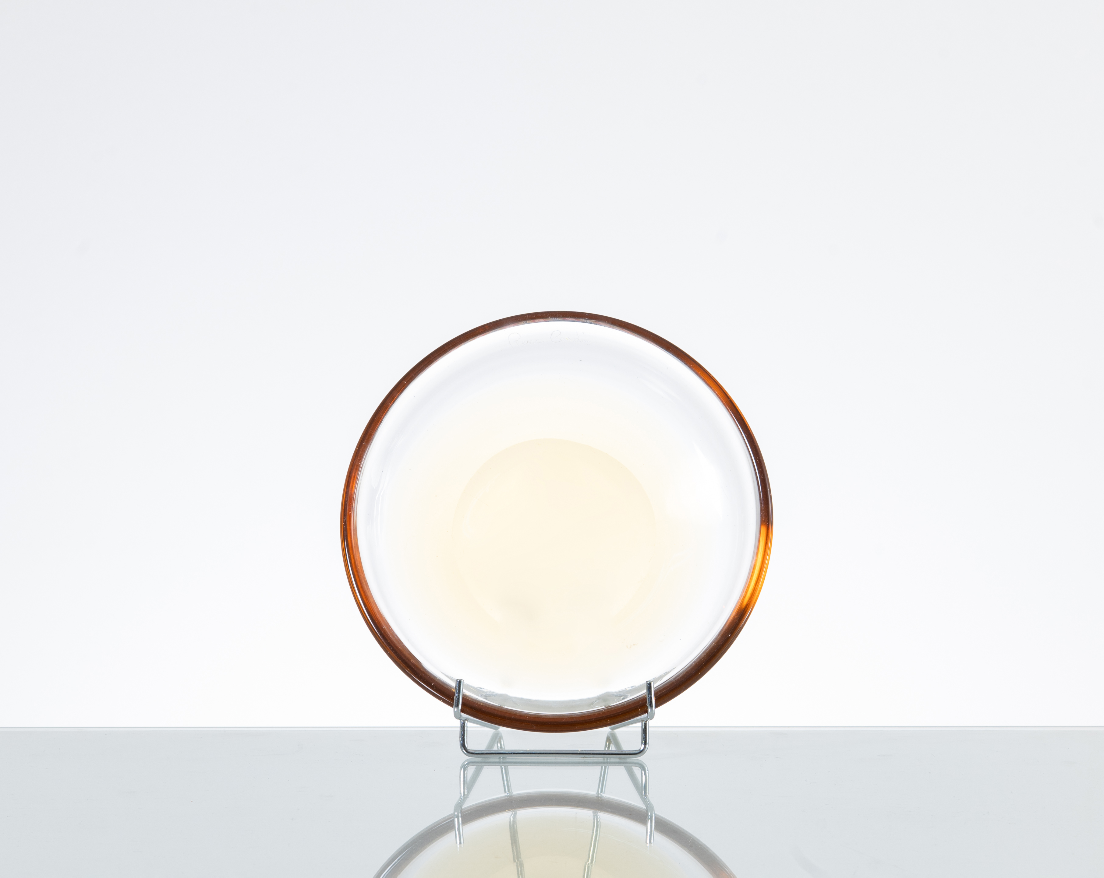 Svuota tasche circolare in vetro sommerso incolore e ambra a sfumare. Firma a graffio.