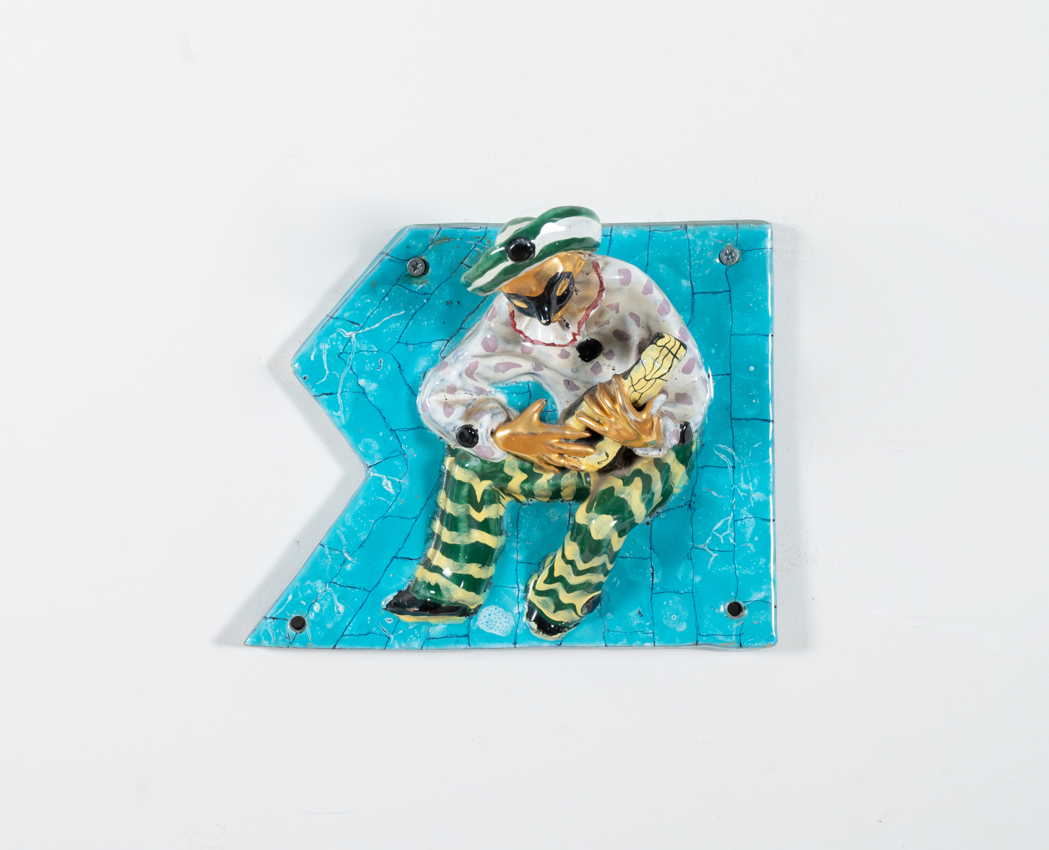 Placca sagomata in ceramica invetriata e smaltata in policromia con figura a rilievo di personaggio carnevalesco suonatore di chitarra. Marchio di produzione.