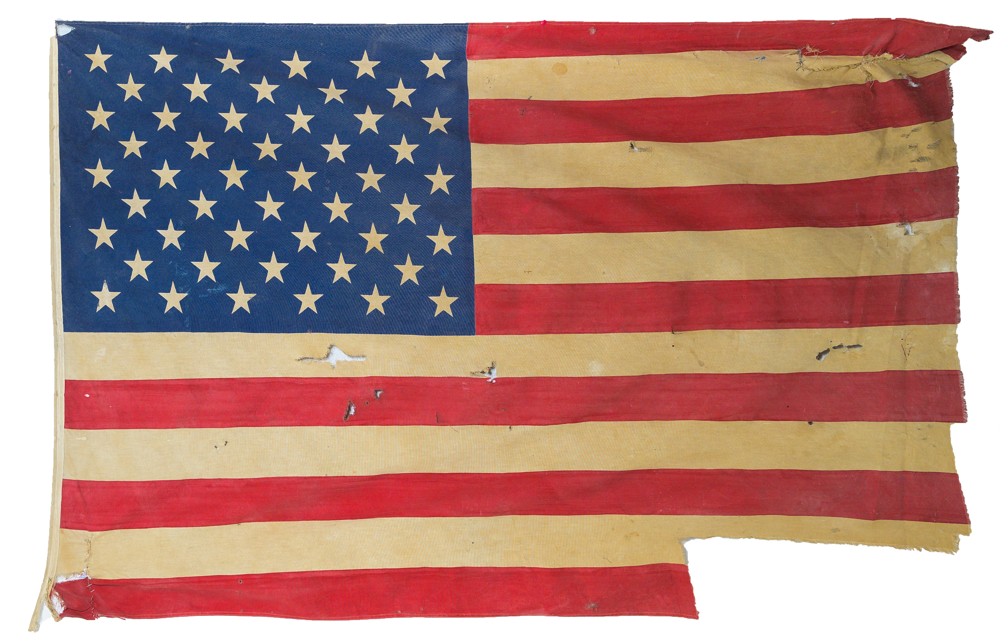Una bandiera teatrale degli Stati Uniti D'America in cotone stampato, manico in legno foderato (usure e difetti).